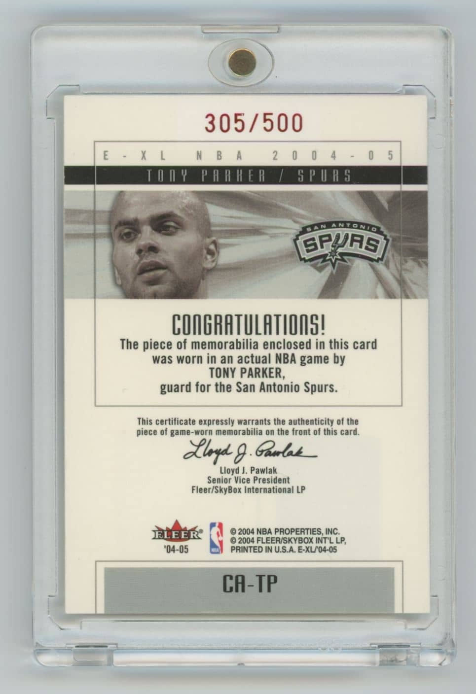 2004 SkyBox E-XL Court Authentics Tony Parker CA-TP 305/500 featuring Tony Parker from the San Antonio Spurs. Card #CA-TP Serial numbered 305/500.