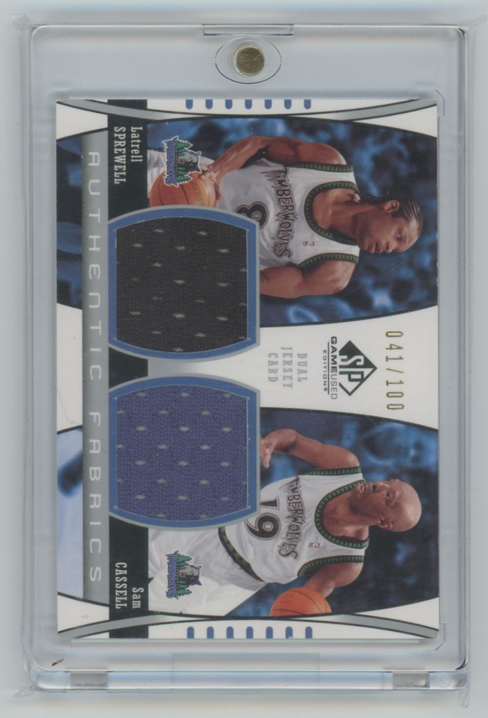 2004 SP Game Used Authentic Fabrics Dual Latrell Sprewell/Sam Cassell AF2-SC 041/100 card from the Minnesota Timberwolves.