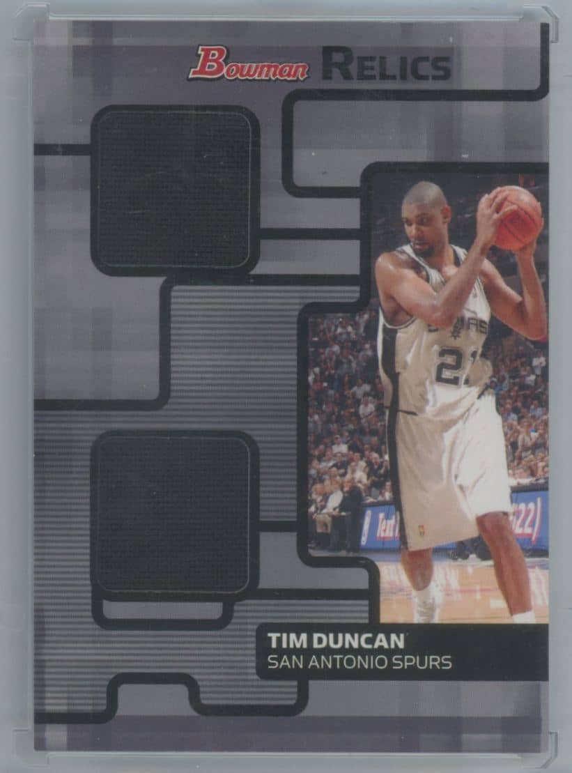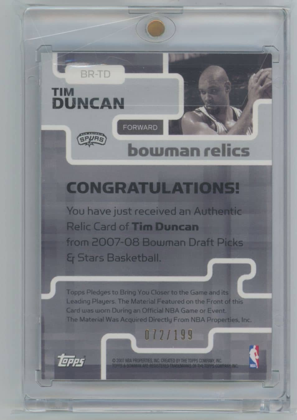 2007 Bowman Relics Dual Tim Duncan BR-TD 072/199 featuring Tim Duncan from the San Antonio Spurs. Card #BR-TD.