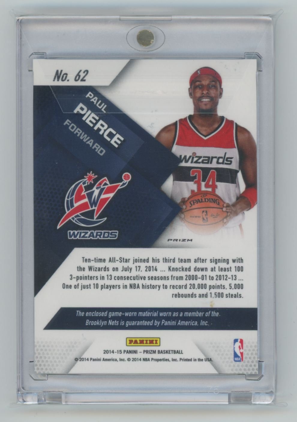 2014 Panini Prizm Jerseys Prizms Blue Mojo Paul Pierce 62 card from the Washington Wizards.