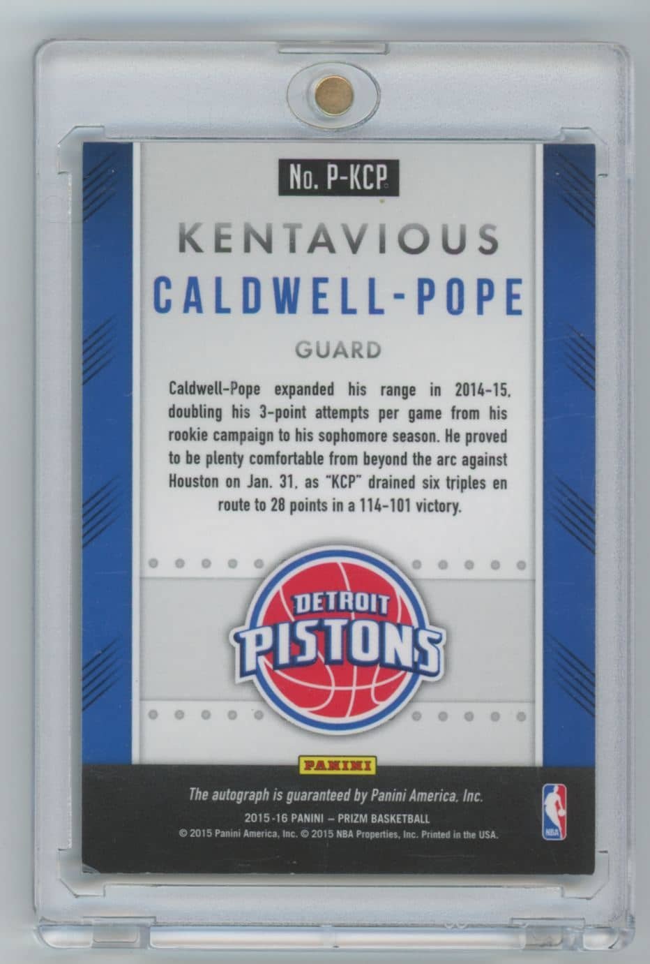 2015 Panini Prizm Autographs Kentavious Caldwell-Pope P-KCP autographed featuring Kentavious Caldwell-Pope from the Detroit Pistons. Card #P-KCP.
