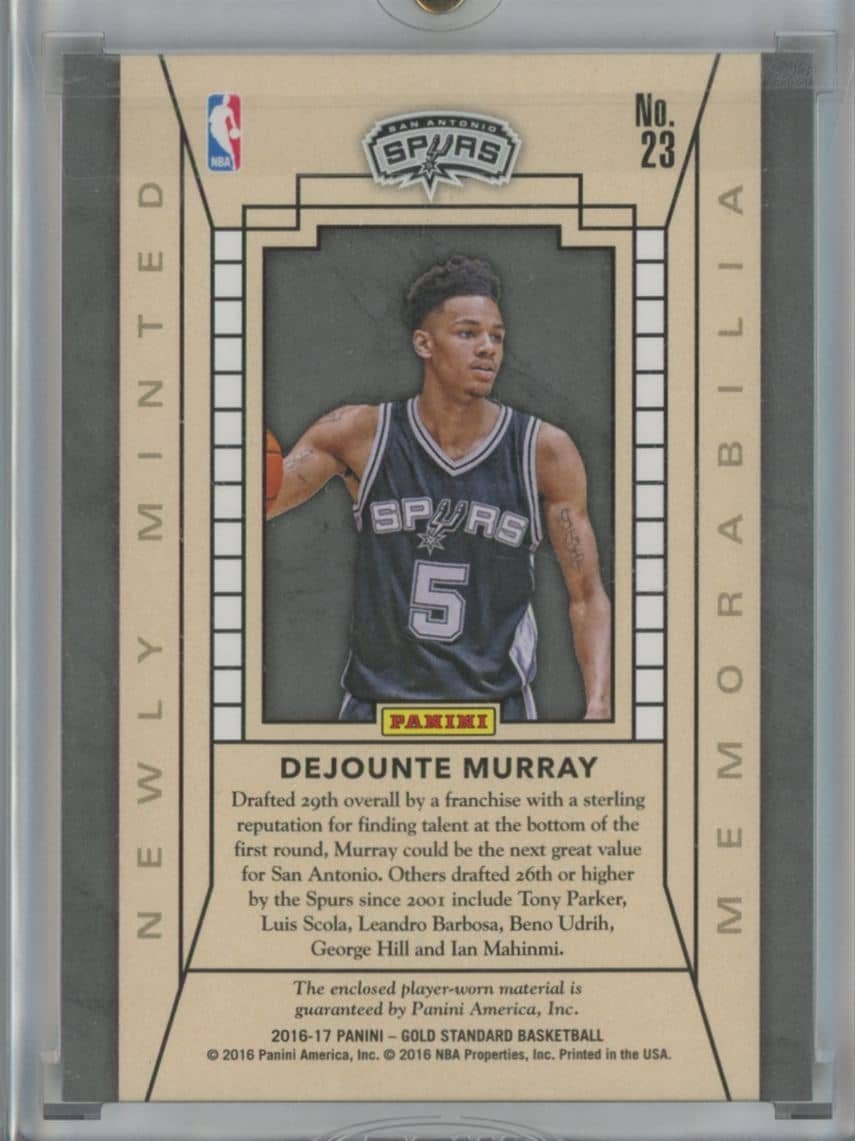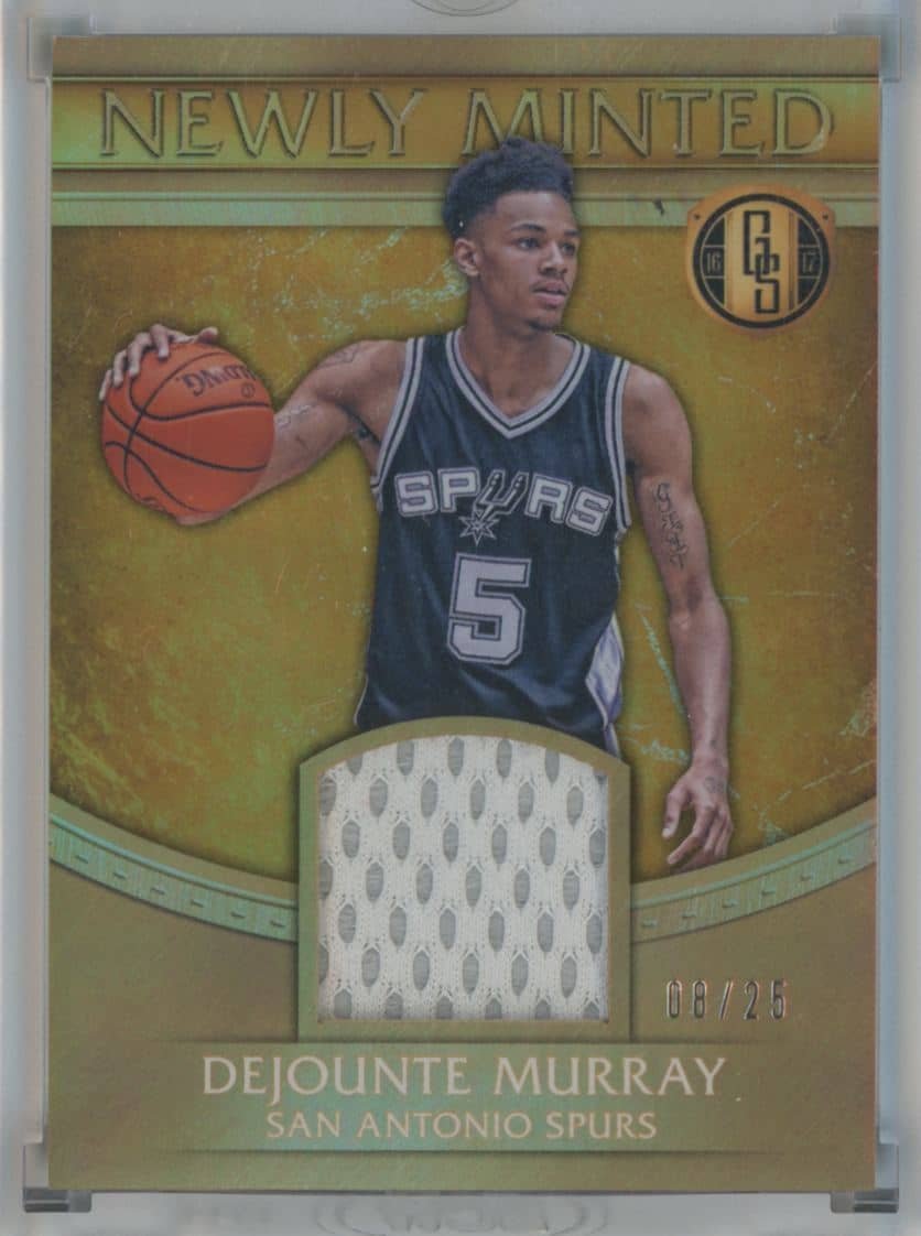 2016 Panini Gold Standard Newly Minted Memorabilia Dejounte Murray 23 08/25 featuring Dejounte Murray from the San Antonio Spurs. Card #23 Serial numbered 25-Aug.
