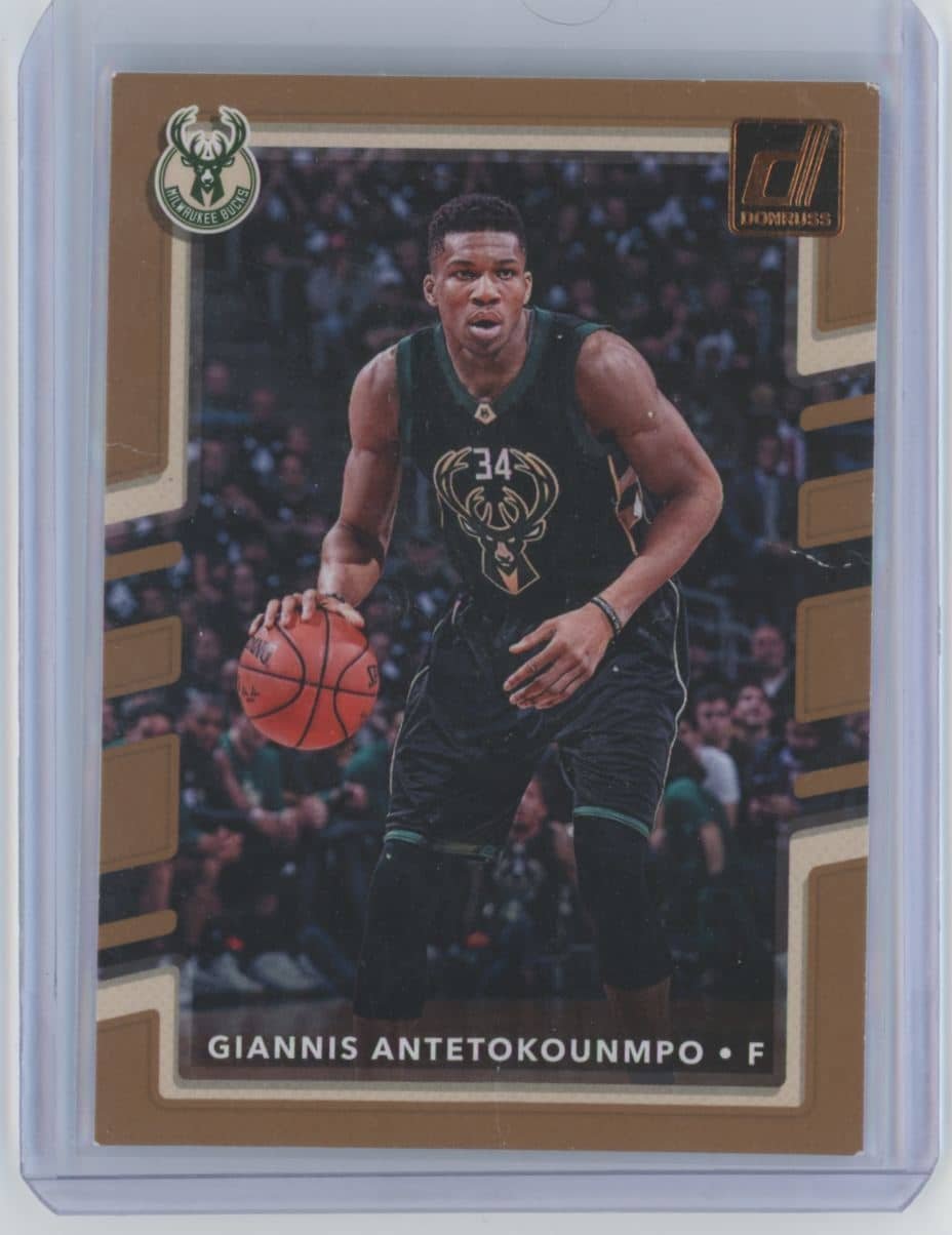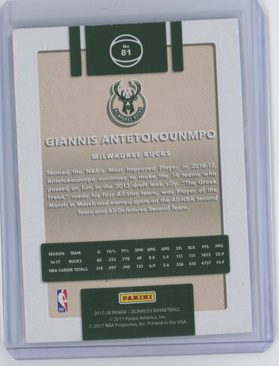 2017 Panini Donruss Giannis Antetokounmpo 81 featuring Giannis Antetokounmpo from the Milwaukee Bucks. Card #81.