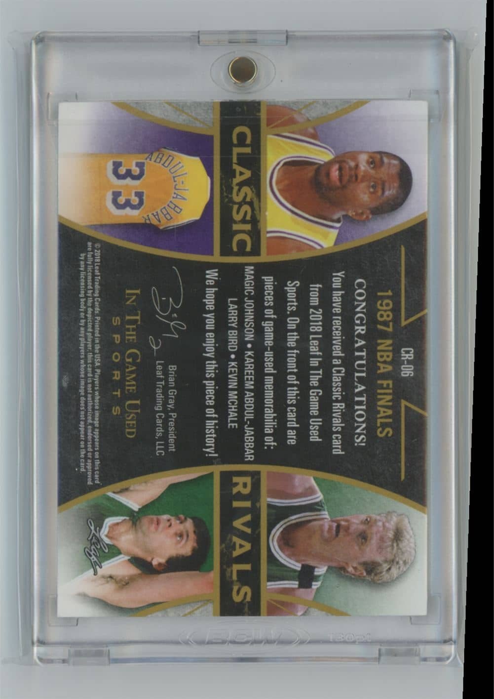 2018 Leaf Classic Rivals Bird, Magic, Kareem, Mchale CR-06 008/20 featuring Bird, Magic, Kareem, Mchale from the Los Angeles Lakers Boston Celtics. Card #CR-06.