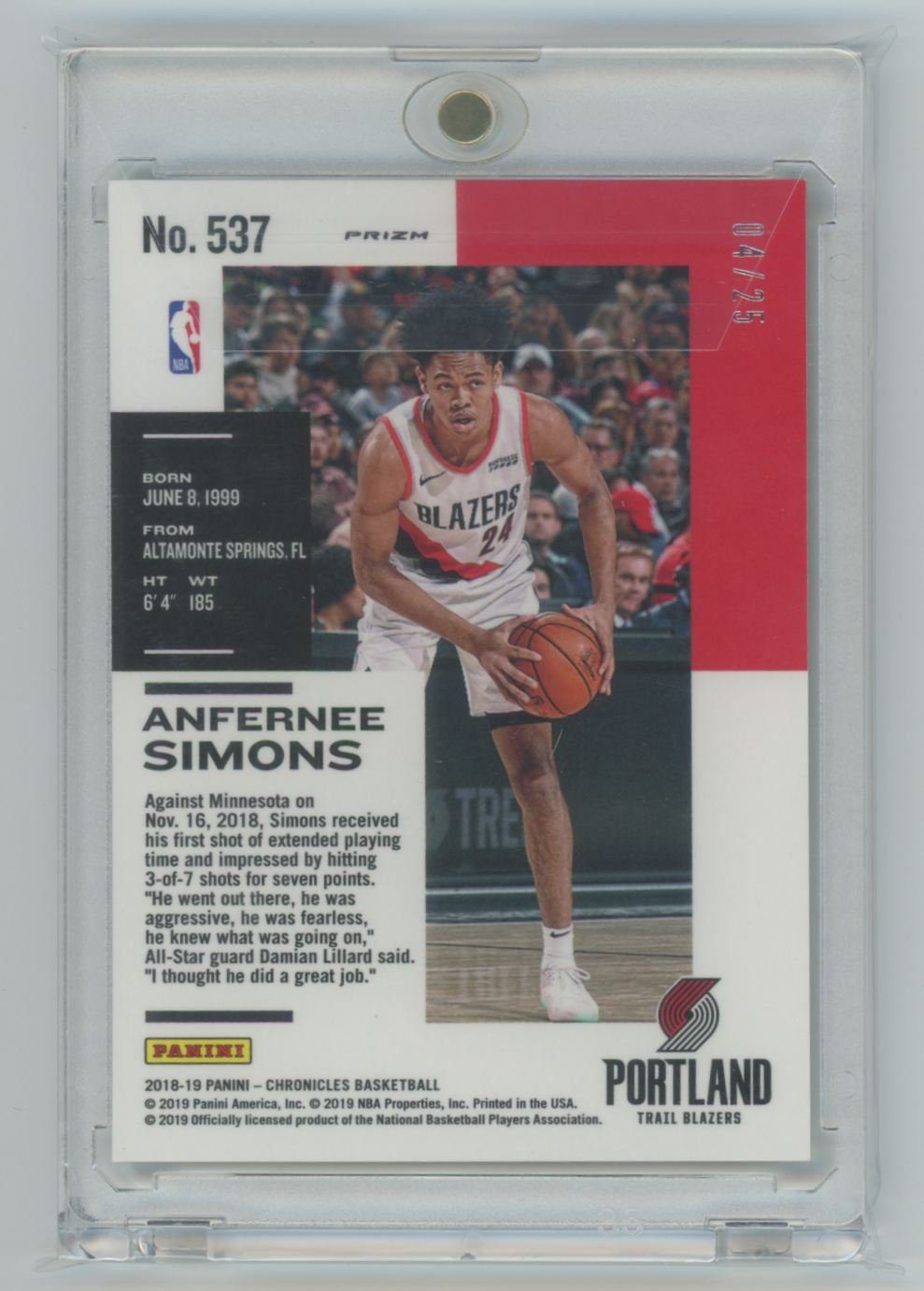 2018 Panini Chronicles Green Anfernee Simons 537 rookie 04/25 card from the Portland Trail Blazers. Serial numbered 04/025.