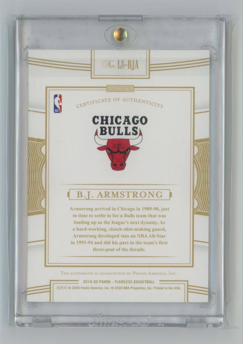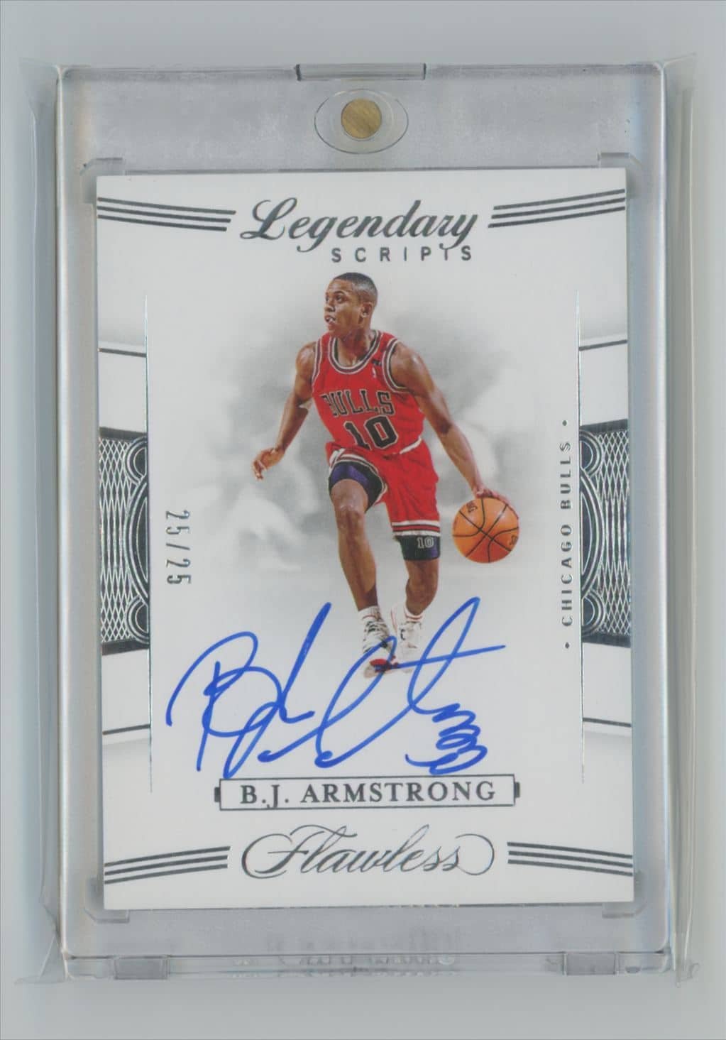 2019 Panini Flawless Legendary Scripts B.J. Armstrong LEG-BJA autographed 25/25 featuring B.J. Armstrong from the Chicago Bulls. Card #LEG-BJA.