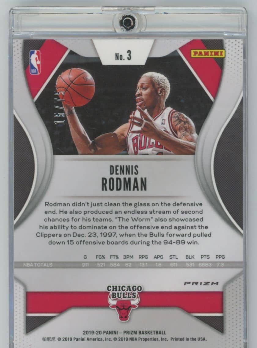 Dennis Rodman 2019 Panini Prizm Prizms Purple Dennis Rodman 3 15/75 featuring the Chicago Bulls. Card #3 Serial 15/75