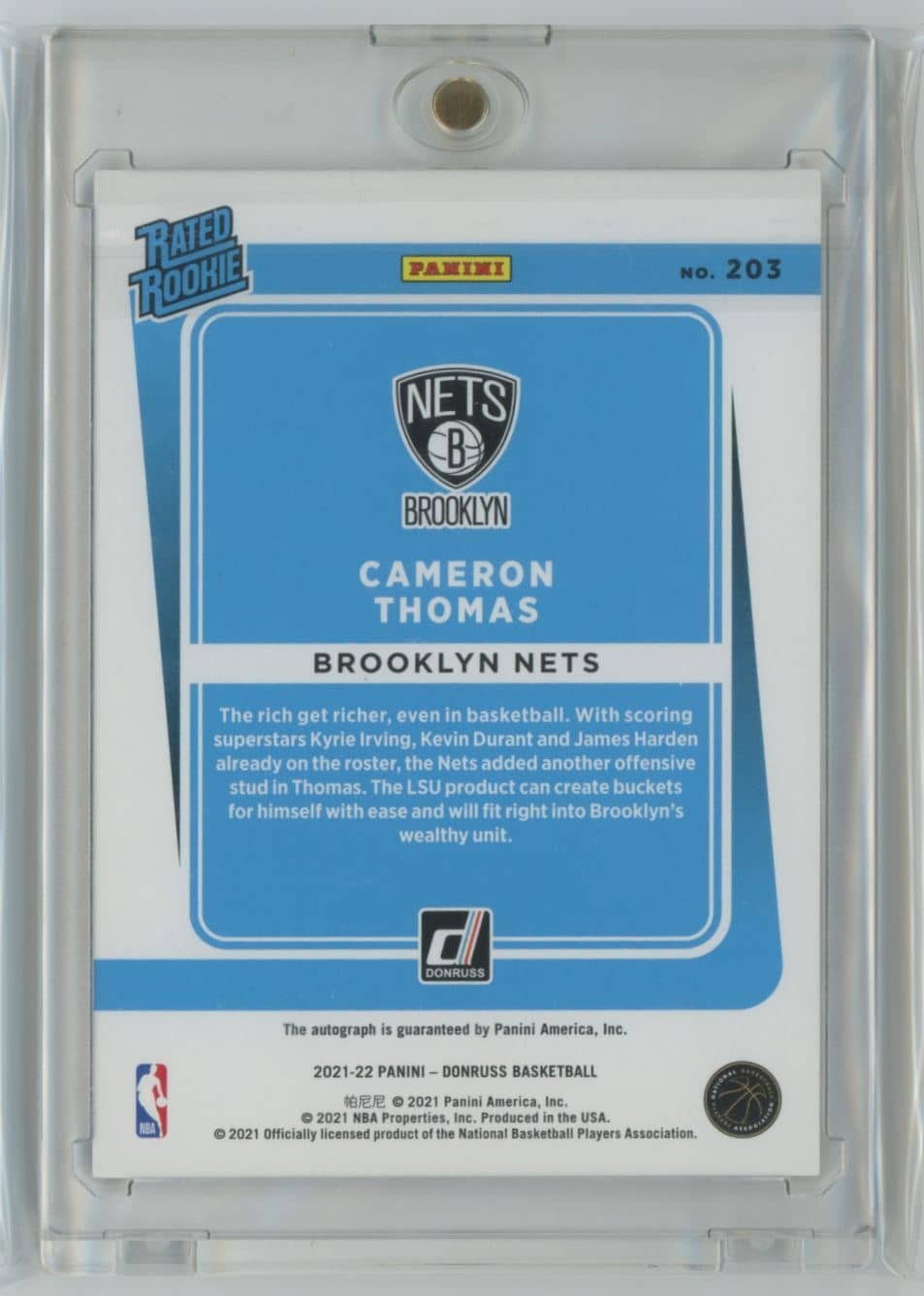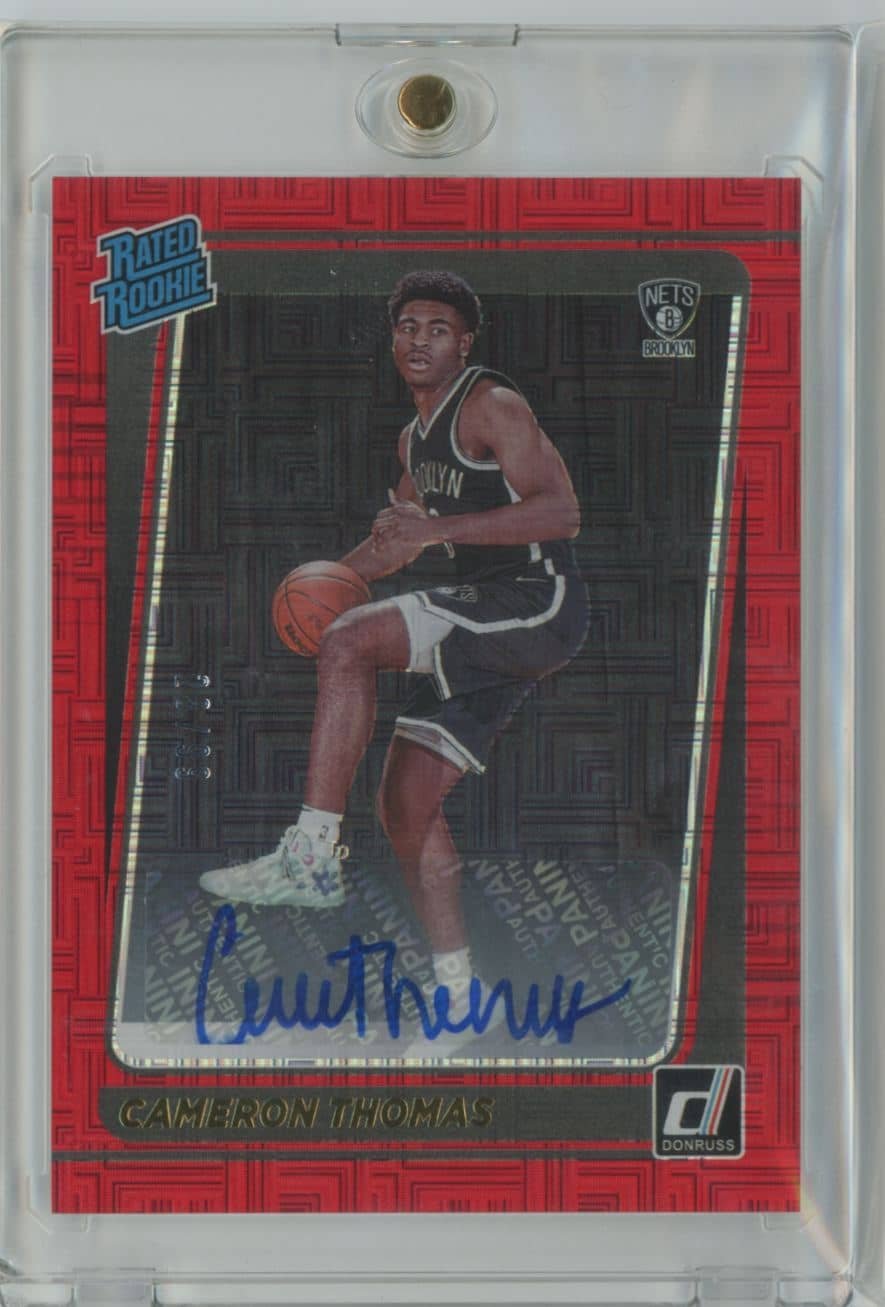 2021 Donruss Rated Rookies Signatures Holo Red and Gold Laser Cameron Thomas 203 autographed 23/99 featuring Cameron Thomas from the Brooklyn Nets. Card #203.