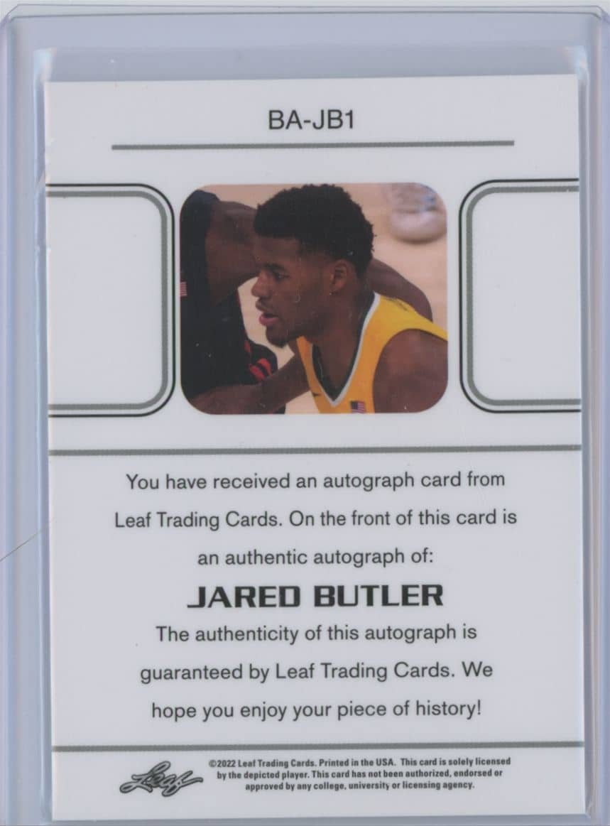 2021 Leaf Jared Butler BA-JB1 rookie autographed featuring Jared Butler from the Chicago Bulls. Card #BA-JB1.