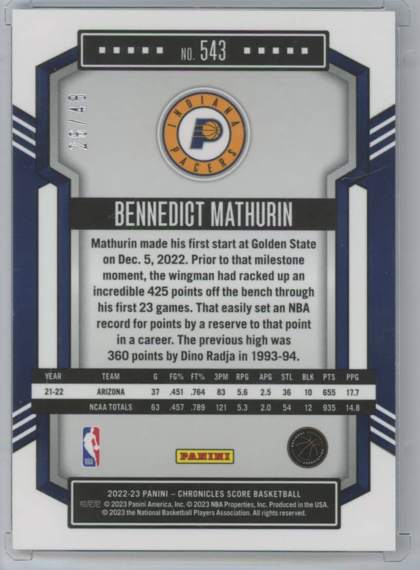 2022 Panini Chronicles Score Asiia Red Bennedict Mathurin 543 rookie 26/48 featuring Bennedict Mathurin from the Indiana Pacers. Card #543 Serial numbered 26/48.