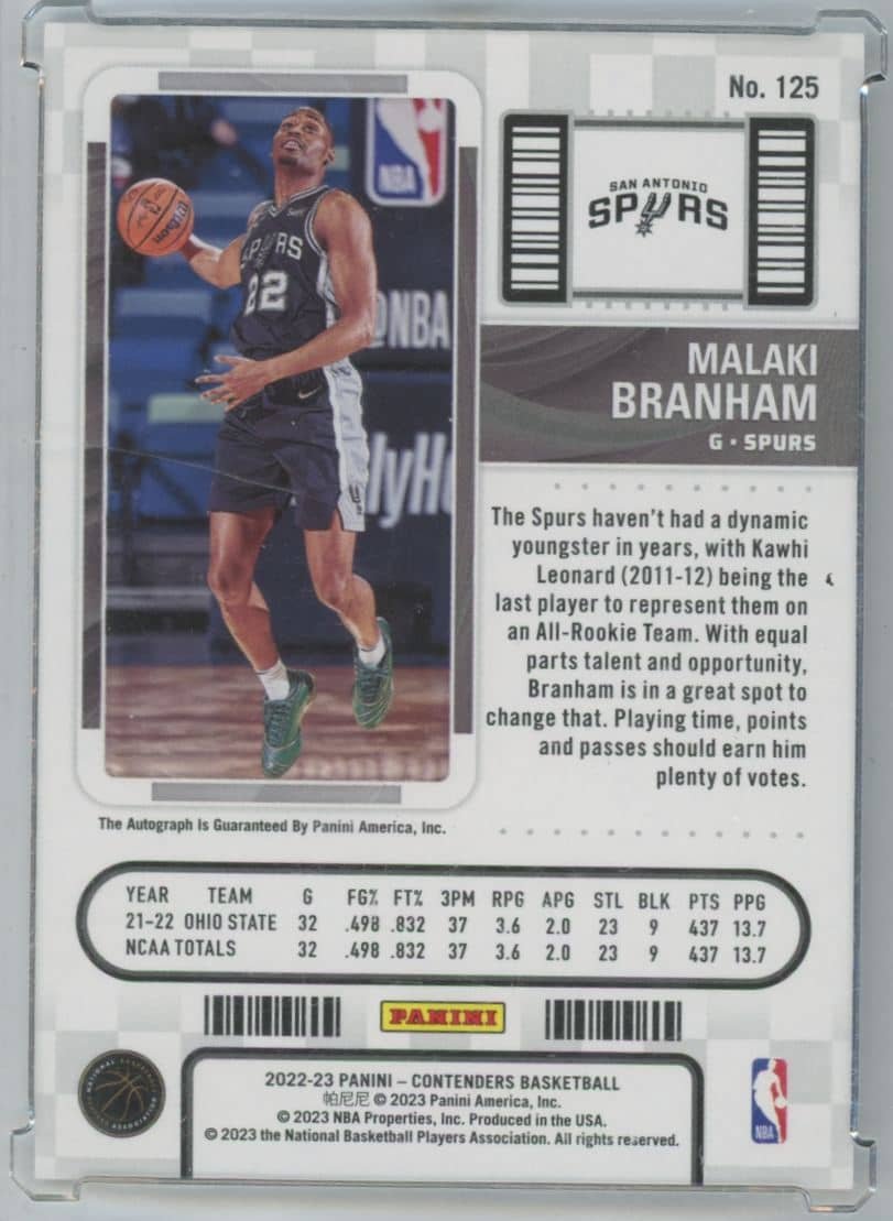 2022 Panini Contenders Malaki Branham 125 rookie autographed featuring Malaki Branham from the San Antonio Spurs. Card #125.