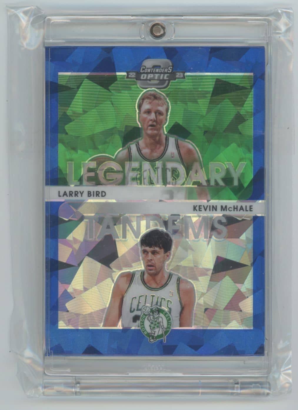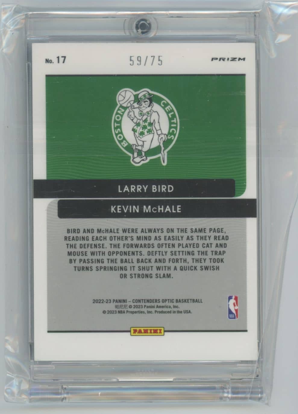 Larry Bird / Kevin McHale 2022 Panini Contenders Optic Legendary Tandems Blue Cracked Ice Larry Bird / Kevin McHale 17 59/75 featuring the Boston Celtics. Card #17 Serial 59/75