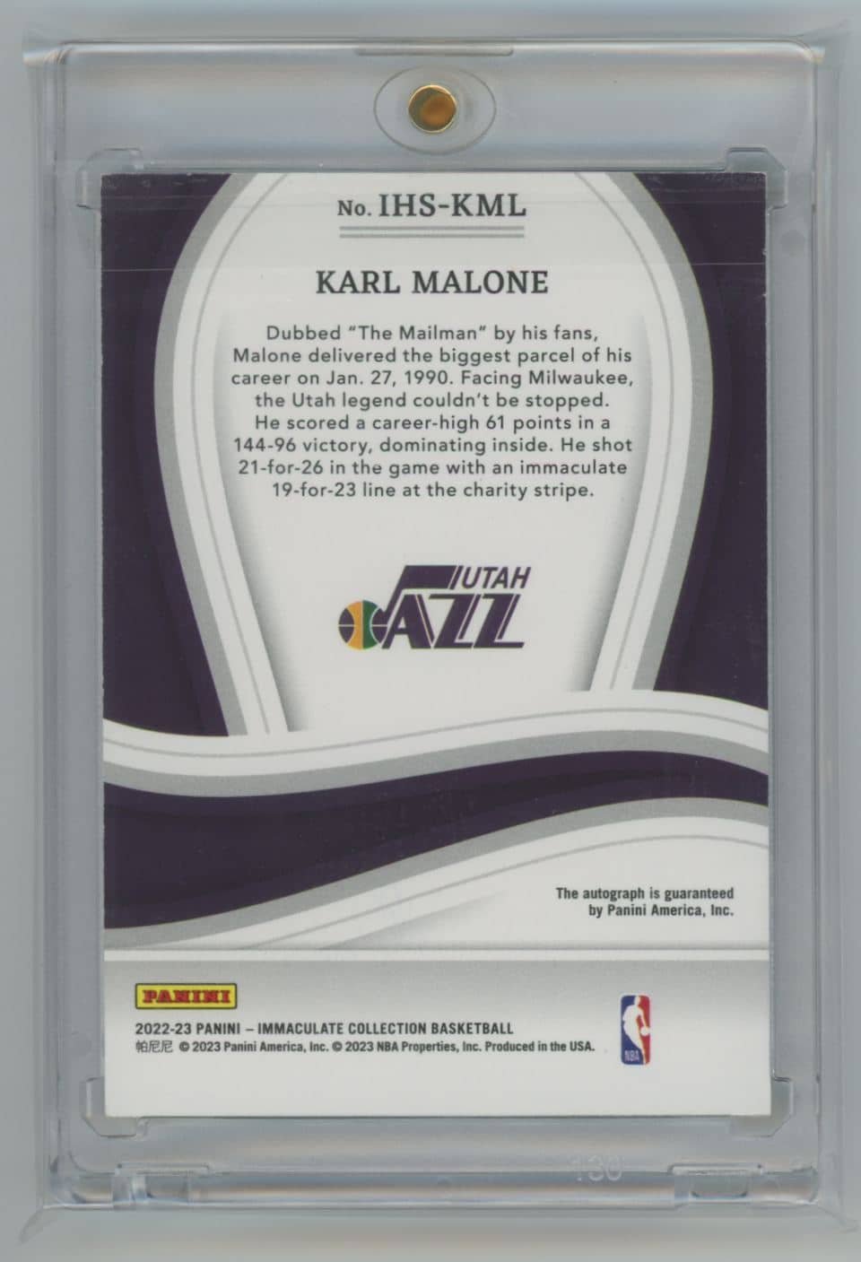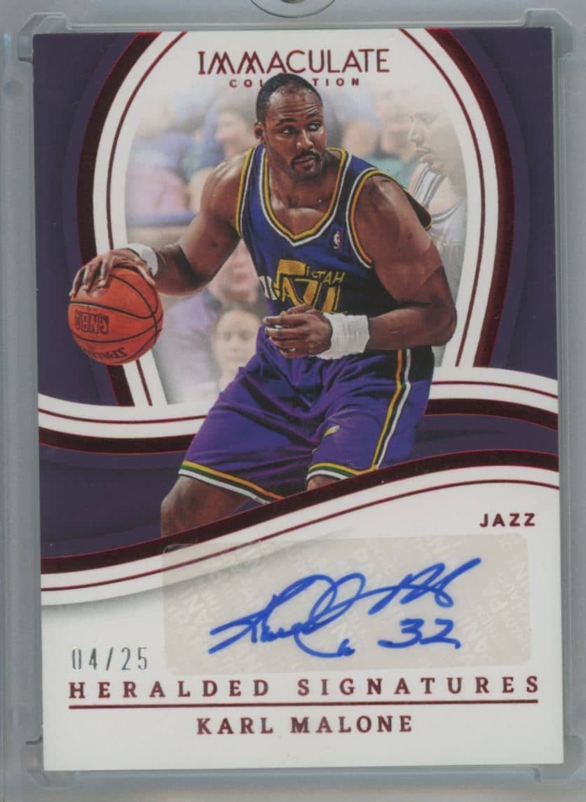 2022 Panini Immaculate Collection Heralded Signatures Red Karl Malone IHS-KML autographed 04/25 featuring Karl Malone from the Utah Jazz. Card #IHS-KML Serial numbered 25-Apr.