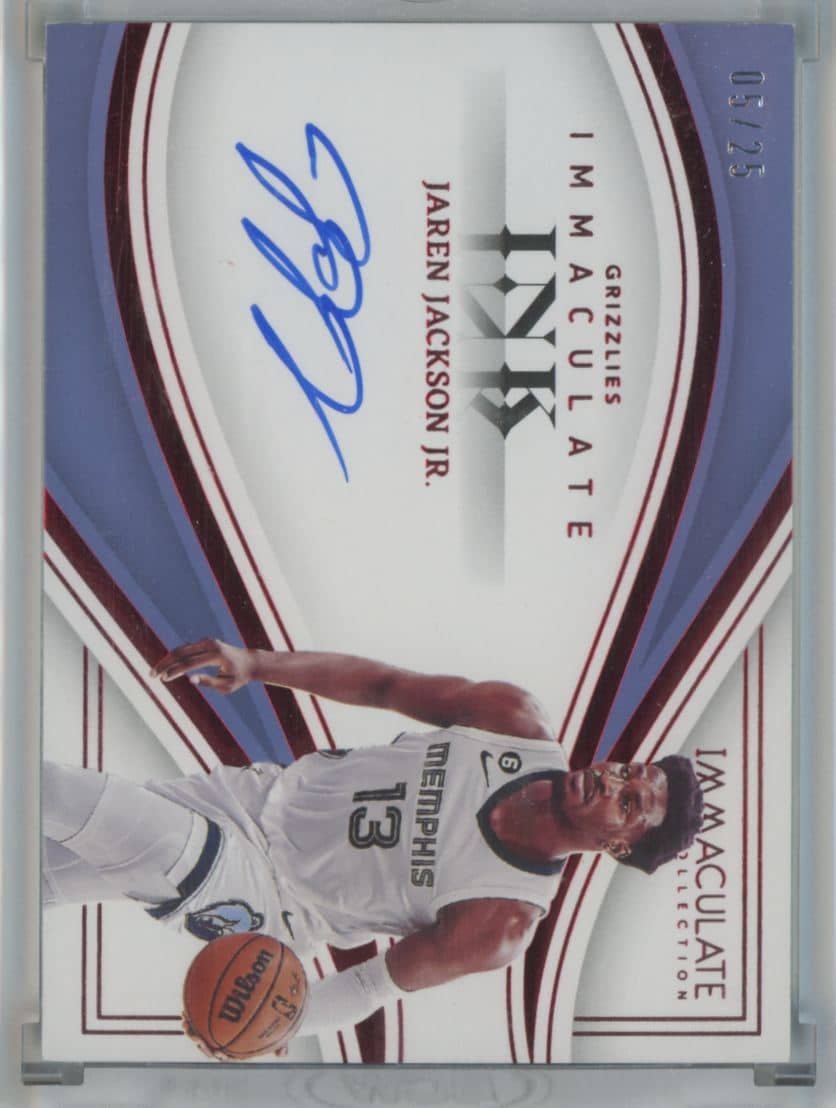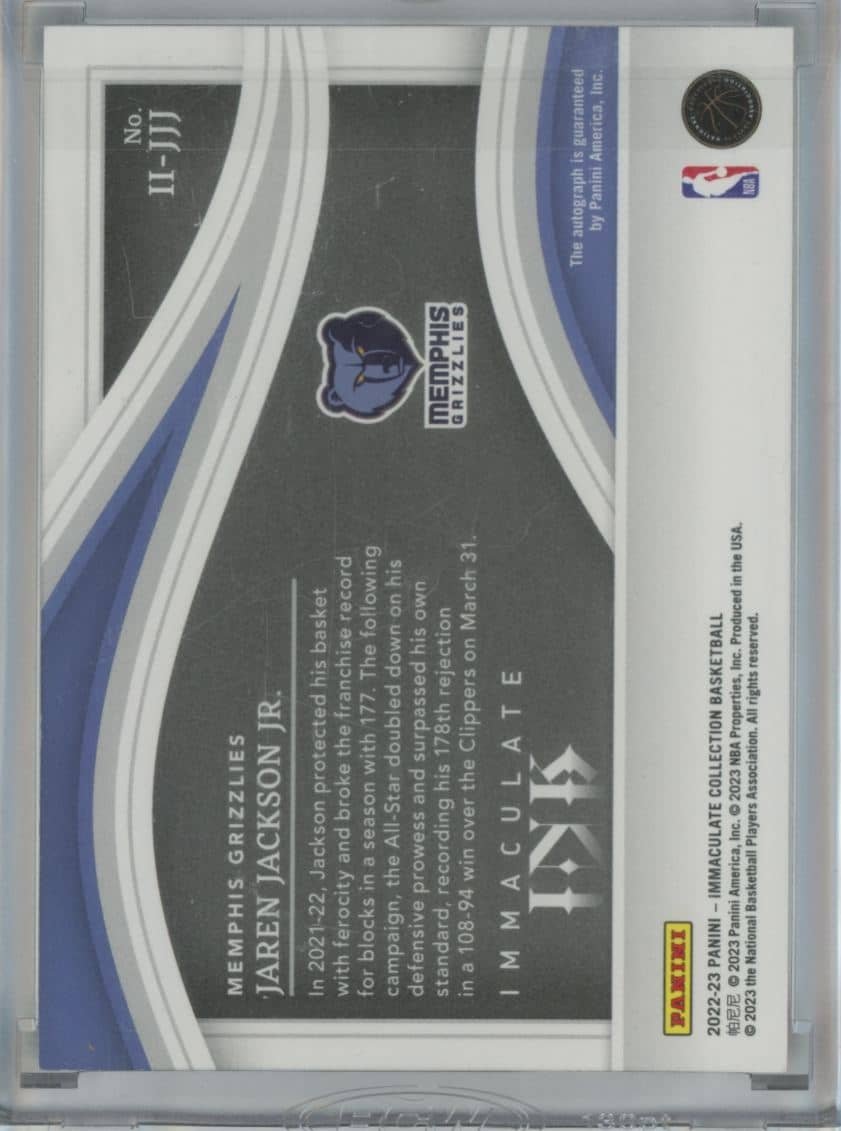 2022 Panini Immaculate Collection Ink Red Jaren Jackson Jr. II-JJJ autographed 05/25 featuring Jaren Jackson Jr. from the Memphis Grizzlies. Card #II-JJJ Serial numbered 25-May.