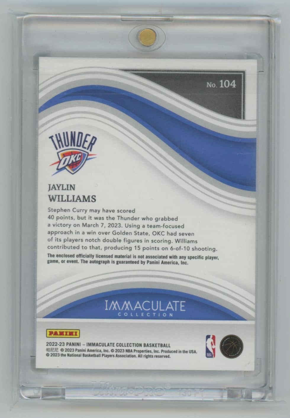 2022 Panini Immaculate Collection Red Jaylin Williams 104 rookie autographed 42/49 featuring Jaylin Williams from the Oklahoma City Thunder. Card #104.