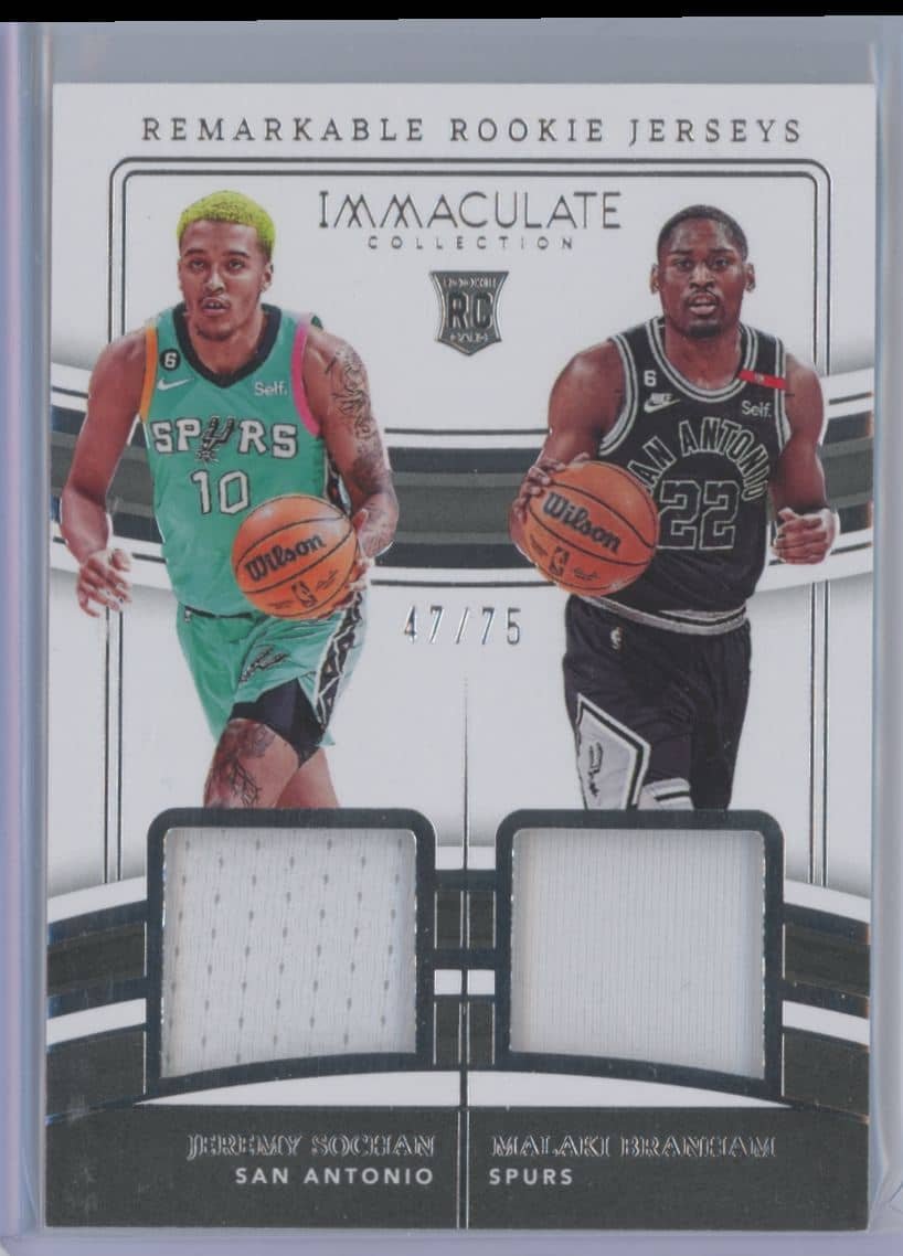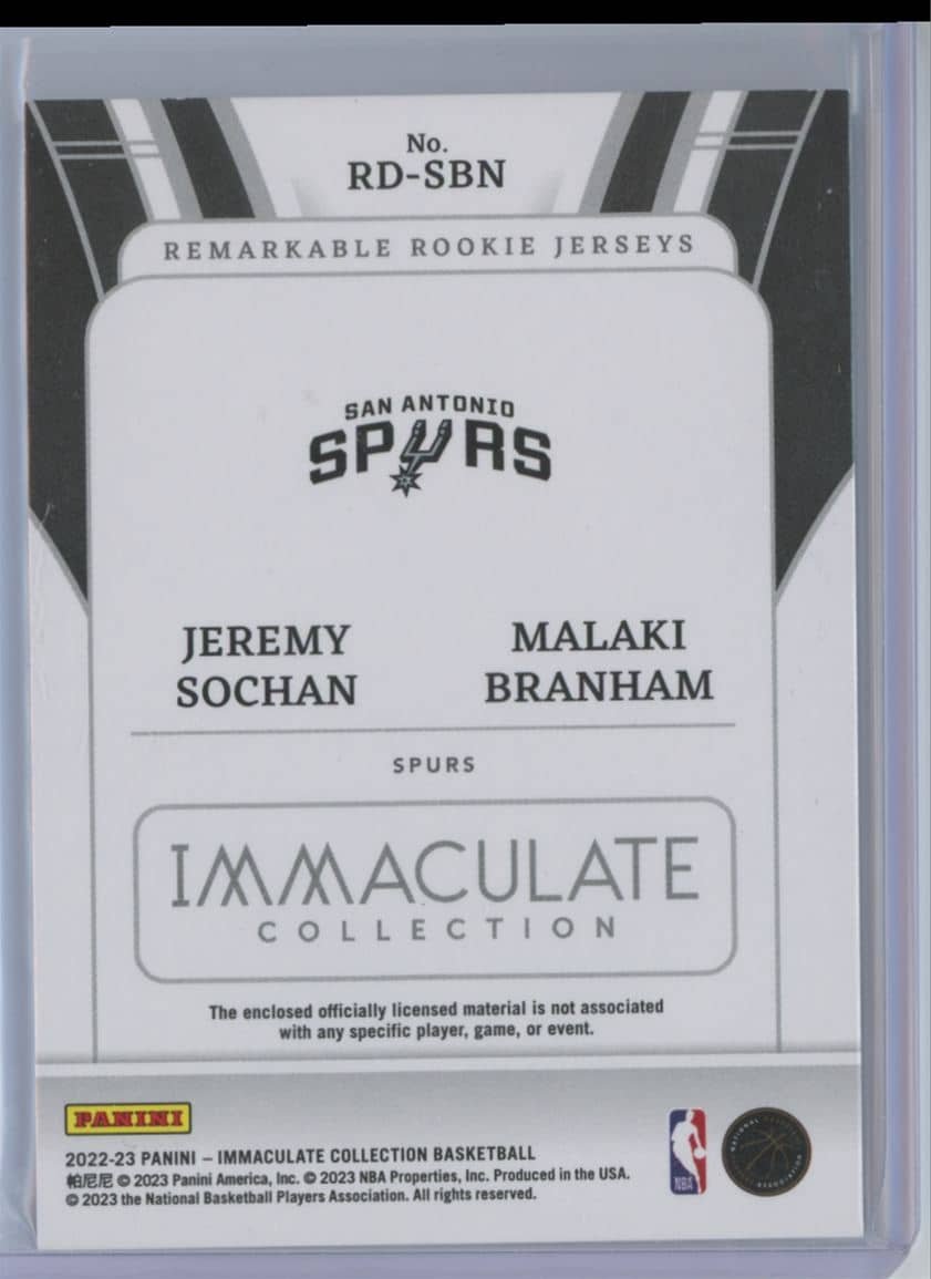 2022 Panini Immaculate Collection Remarkable Rookie Jerseys Dual Jeremy Sochan / Malaki Branham RD-SBN rookie 47/75 featuring Jeremy Sochan / Malaki Branham from the San Antonio Spurs. Card #RD-SBN.