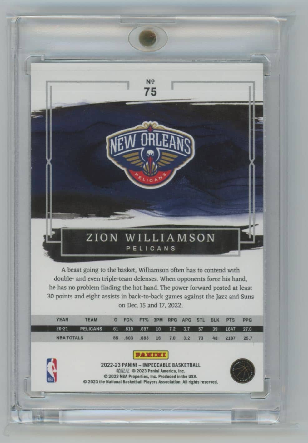 2022 Panini Impeccable Zion Williamson 75 14/75 featuring Zion Williamson from the New Orleans Pelicans. Card #75.