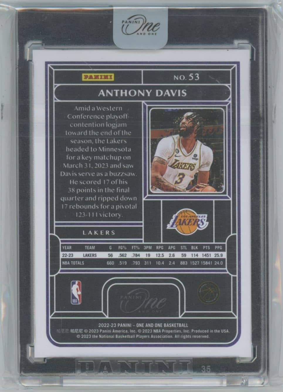 Anthony Davis 2022 Panini One and One Anthony Davis 53 33/99 featuring the Los Angeles Lakers. Card #53 Serial 33/99