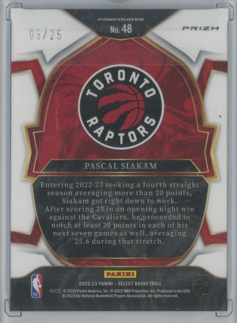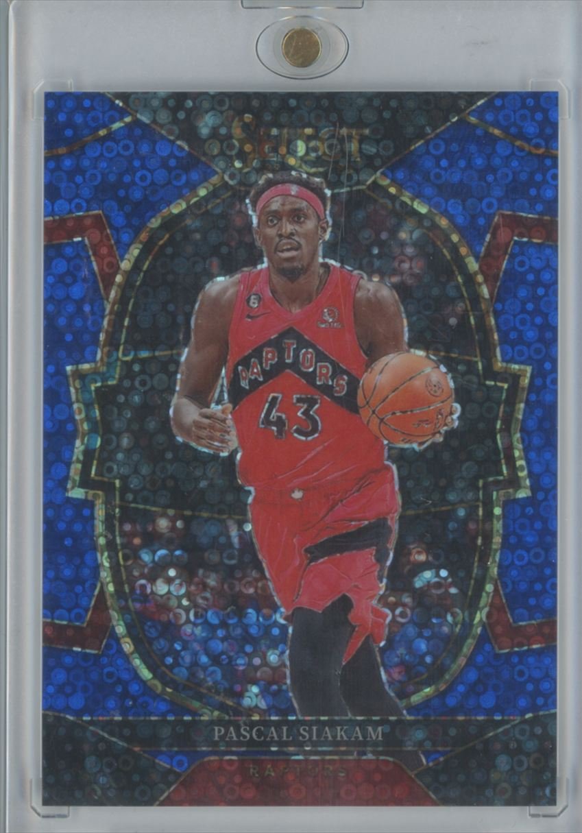 2022 Panini Select Blue Disco Prizms Pascal Siakam 48 03/25 card from the Toronto Raptors. Serial numbered 03/025.