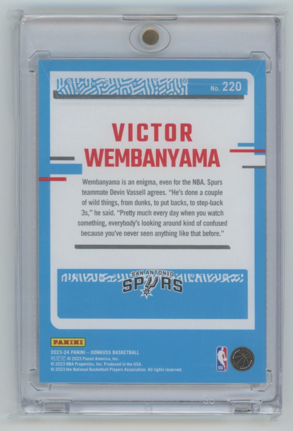 2023 Donruss Victor Wembanyama 220 rookie card from the San Antonio Spurs.
