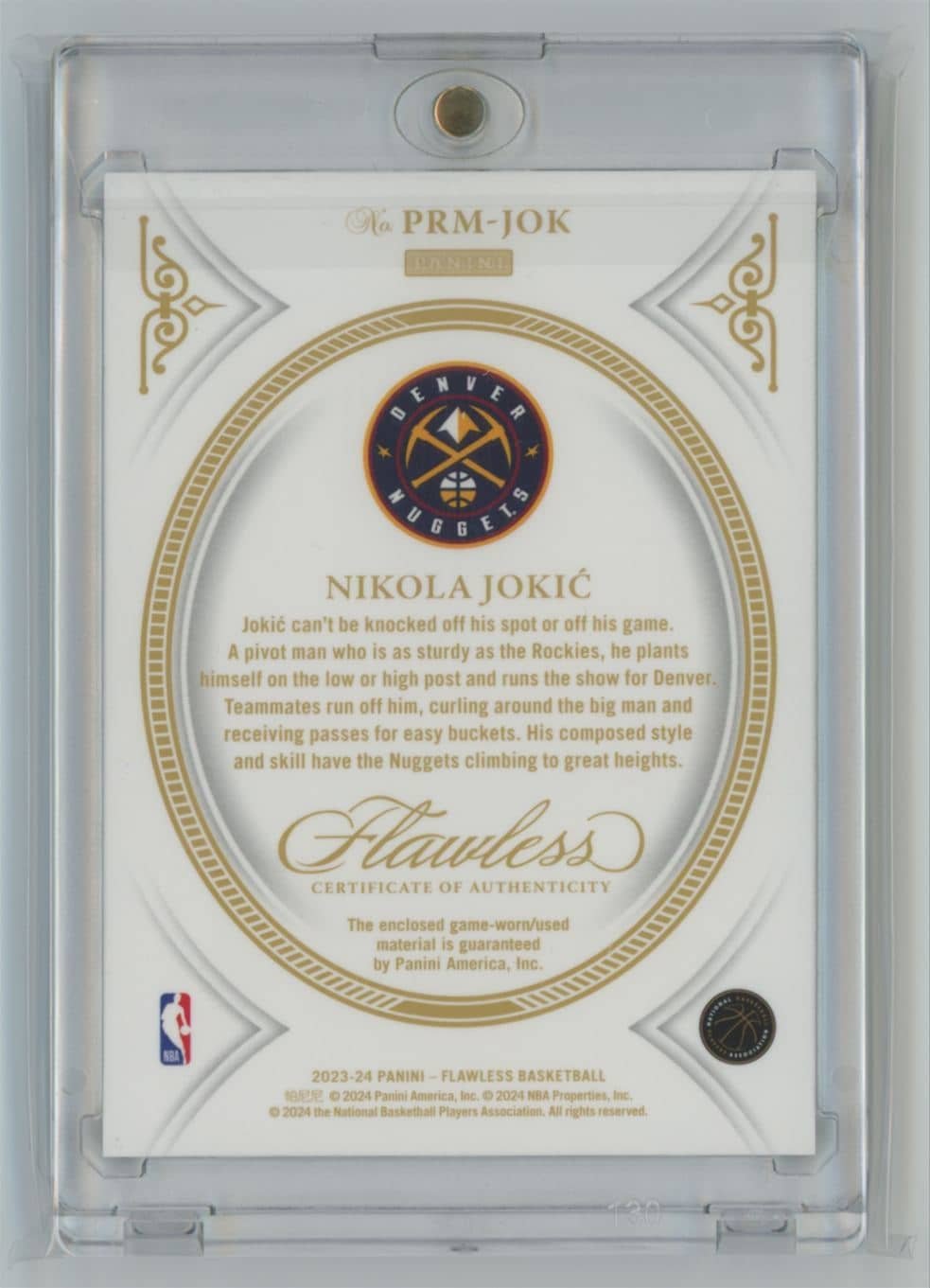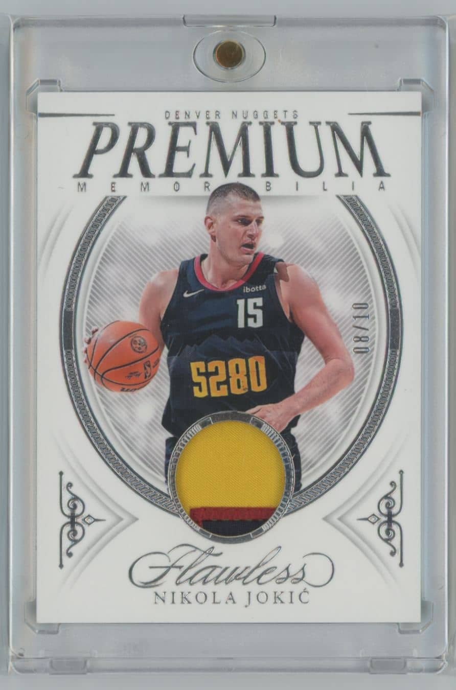 2023 Panini Flawless Nikola Jokic Premium PRM-JOK 008/10 featuring Nikola Jokic Premium from the Denver Nuggets. Card #PRM-JOK.