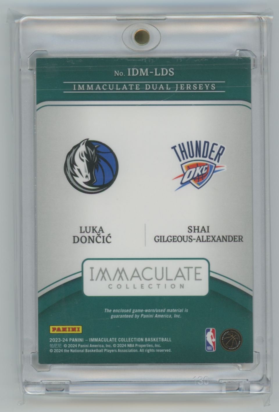 2023 Panini Immaculate Collection Dual Memorabilia Shai Gilgeous-Alexander / Luka Doncic IDM-LDS 65/99 card from the Oklahoma City Thunder / Dallas Mavericks.
