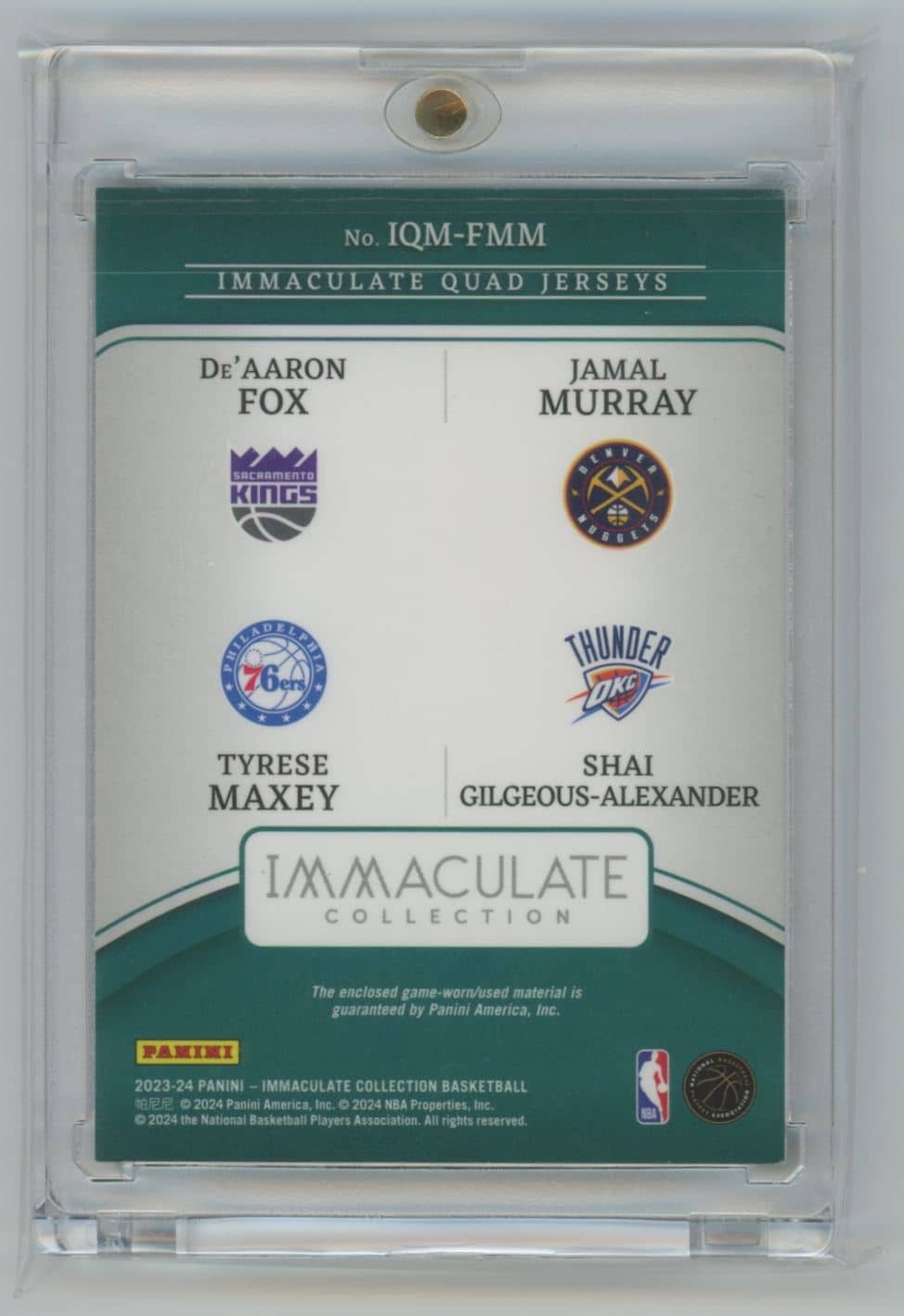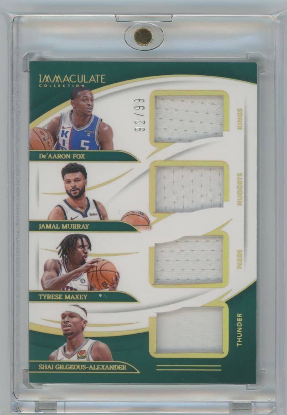 2023 Panini Immaculate Collection Quad Memorabilia Tyrese Maxey / Jamal Murray / Shai Gilgeous-Alexander / De’Aaron Fox IQM-FMM 92/99 featuring Tyrese Maxey / Jamal Murray / Shai Gilgeous-Alexander / De’Aaron Fox from the Philadelphia 76ers / Denver Nuggets / Oklahoma City Thunder / Sacramento Kings. Card #IQM-FMM.