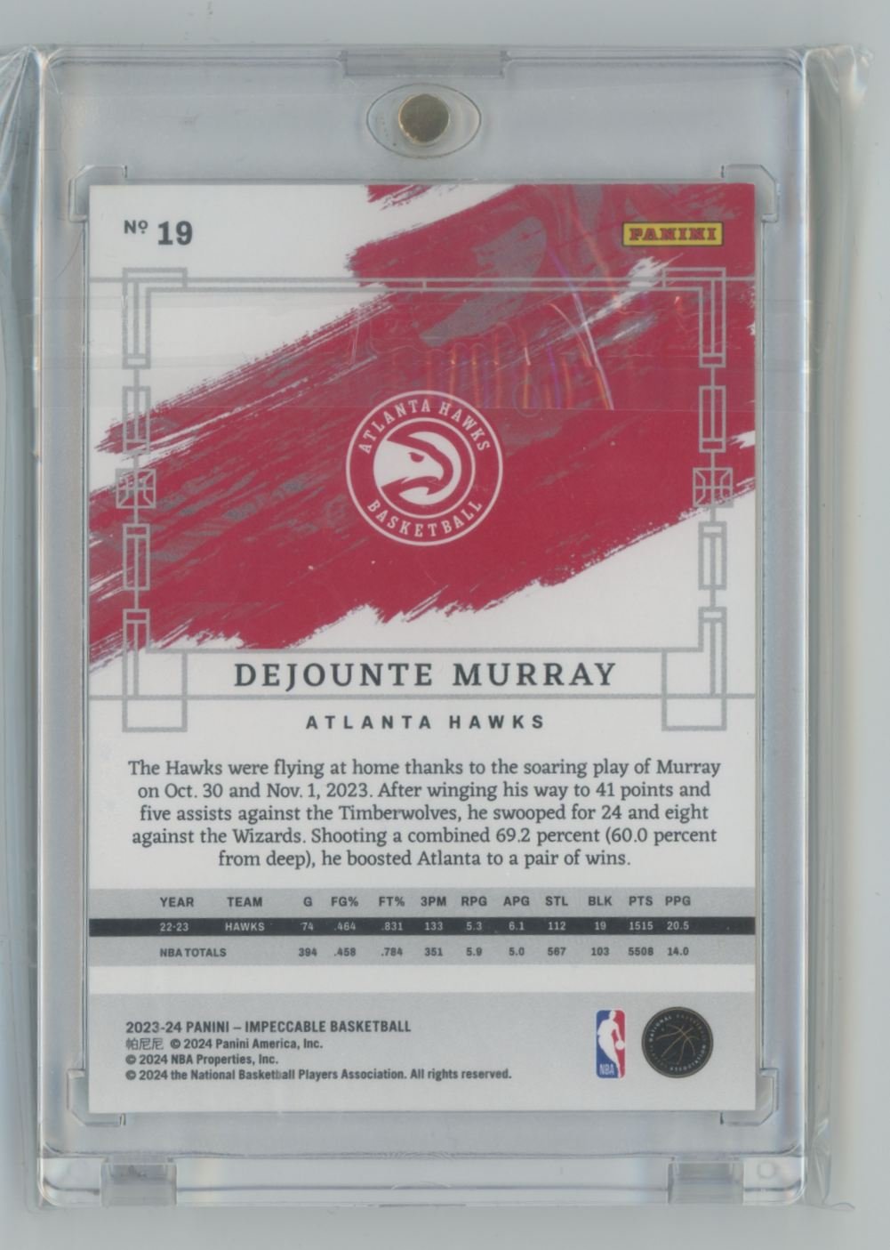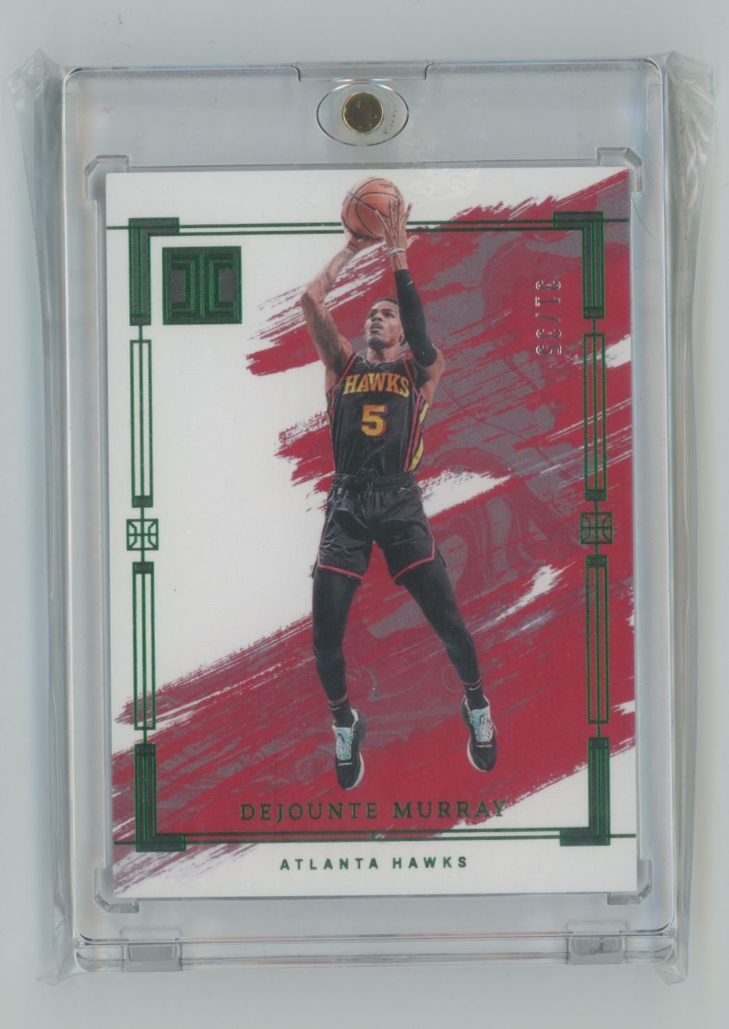 2023 Panini Impeccable Green Dejounte Murray 19 31/35 card from the Atlanta Hawks.