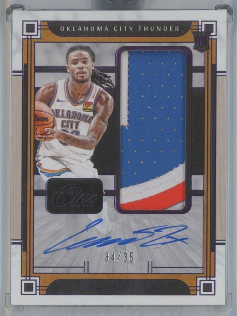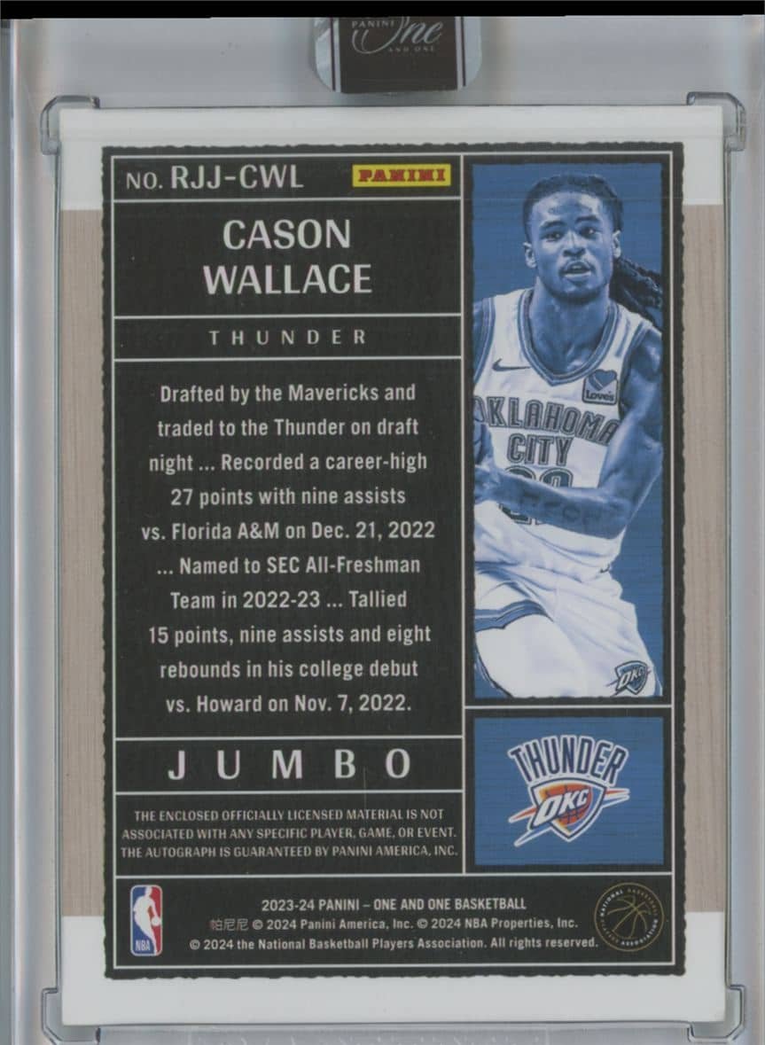 2023 Panini One and One Rookie Jersey Auto Purple SSP Cason Wallace RJJ-CWL rookie autographed 34/35 featuring Cason Wallace from the Oklahoma City Thunder. Card #RJJ-CWL.