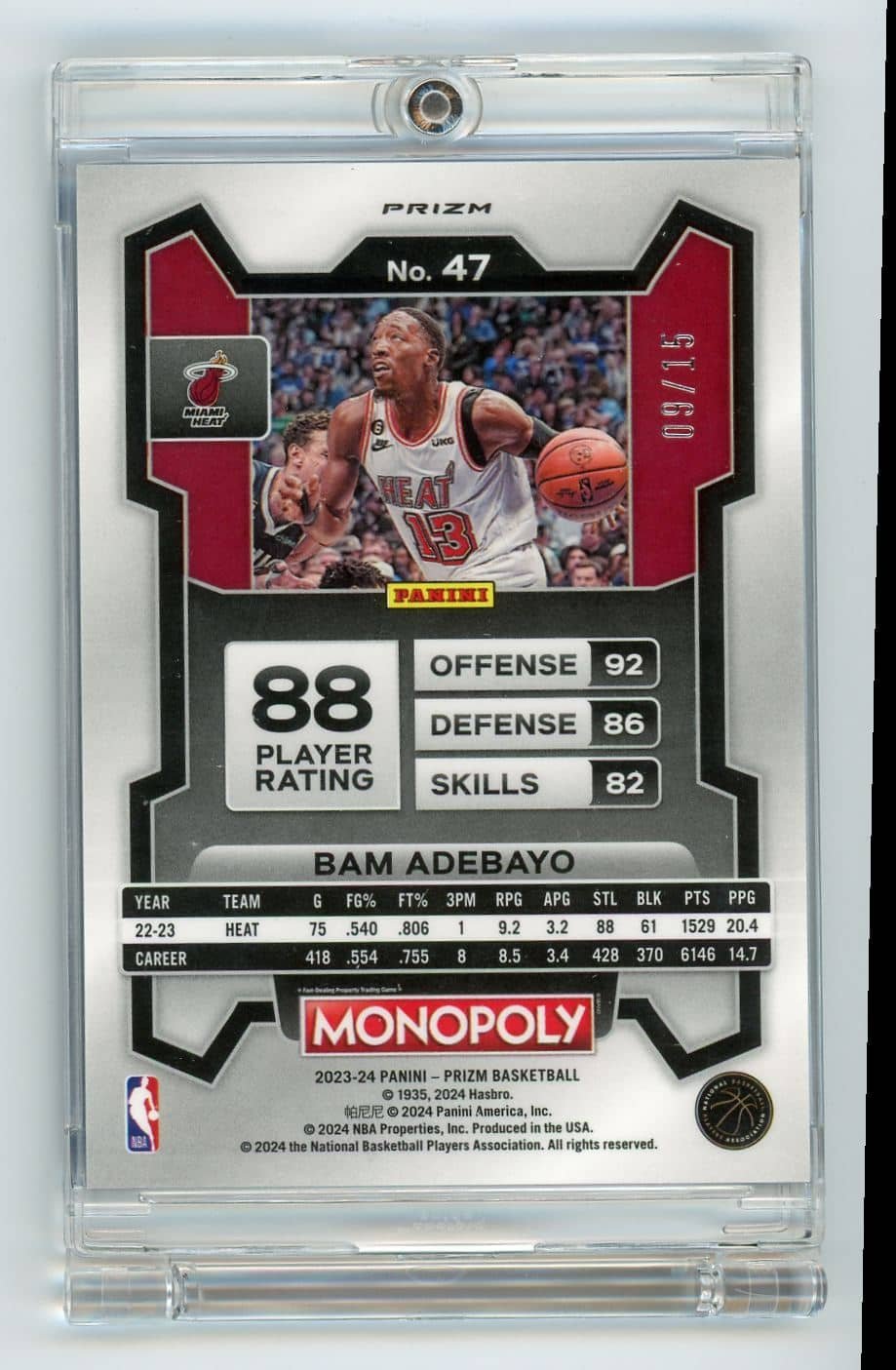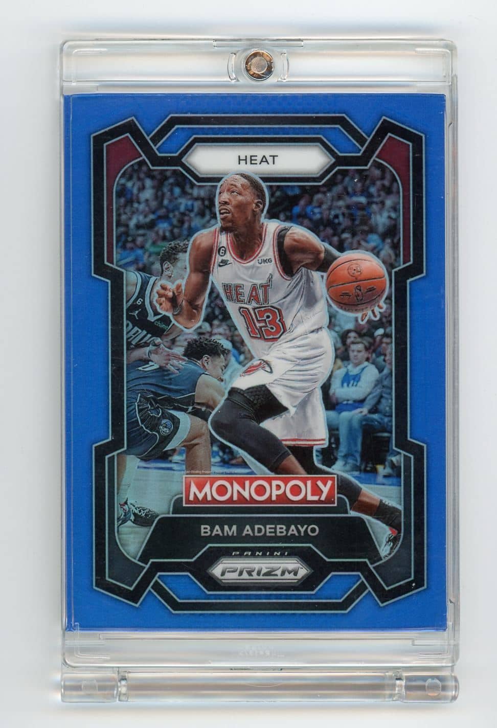 2023 Panini Prizm Monopoly Boardwalk Blue Bam Adebayo 47 09/15 featuring Bam Adebayo from the Miami Heat. Card #47 Serial numbered 15-Sep.