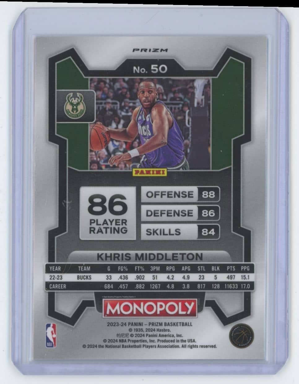 2023 Panini Prizm Monopoly Purple Khris Middleton 50 featuring Khris Middleton from the Milwaukee Bucks. Card #50.