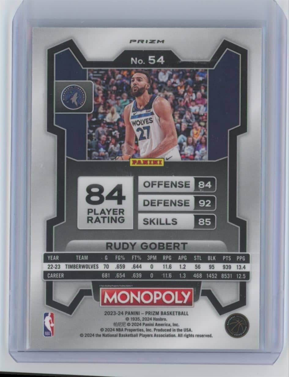 2023 Panini Prizm Monopoly Purple Rudy Gobert 54 featuring Rudy Gobert from the Minnesota Timberwolves. Card #54.