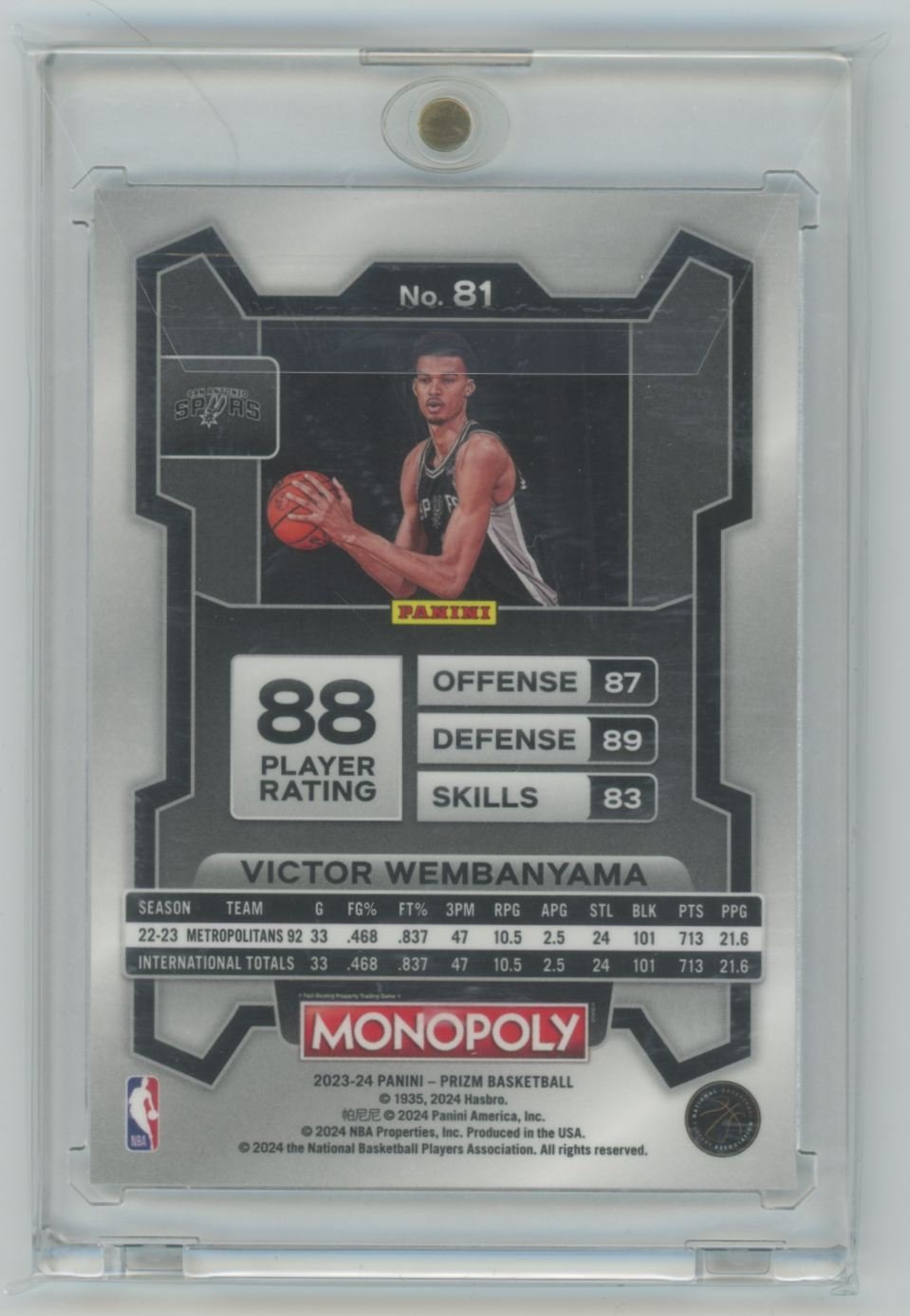 2023 Panini Prizm Monopoly Victor Wembanyama 81 rookie card from the San Antonio Spurs.
