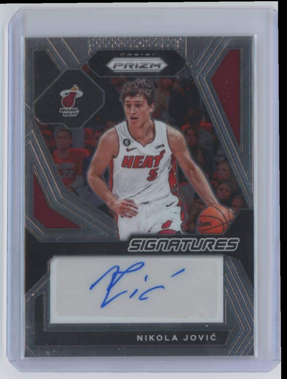 2023 Panini Prizm Signatures Nikola Jovic SIG-JOV autographed featuring Nikola Jovic from the Miami Heat. Card #SIG-JOV.
