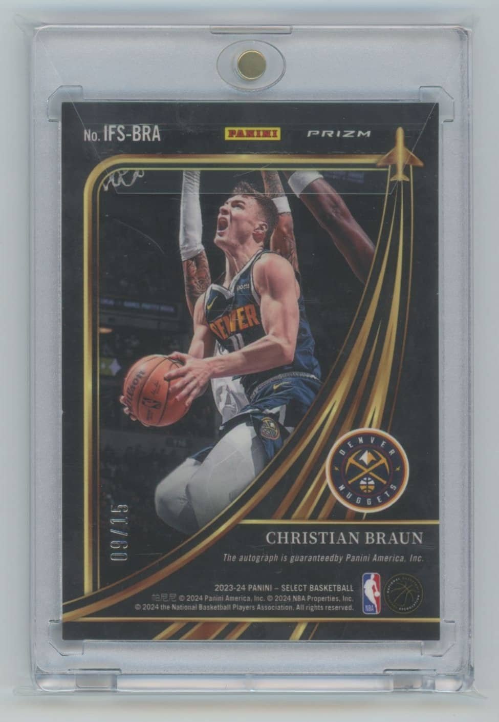 2023 Panini Select Christian Braun IFS-BRA autographed 09/15 featuring Christian Braun from the Denver Nuggets. Card #IFS-BRA Serial numbered 15-Sep.