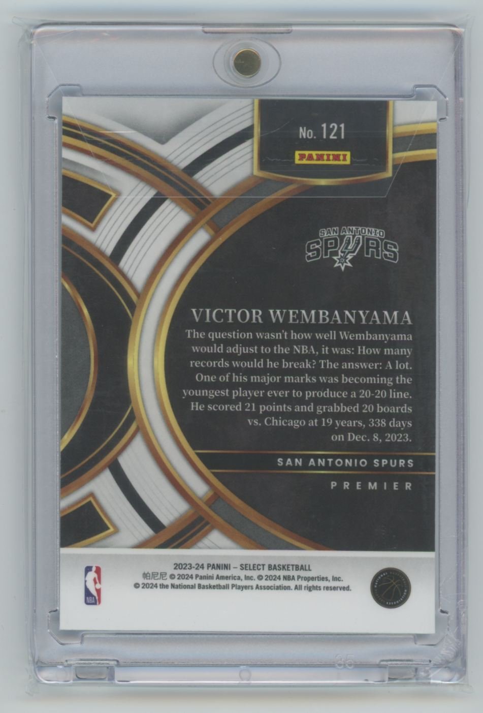 2023 Panini Select Premier Level Victor Wembanyama 121 rookie card from the San Antonio Spurs.
