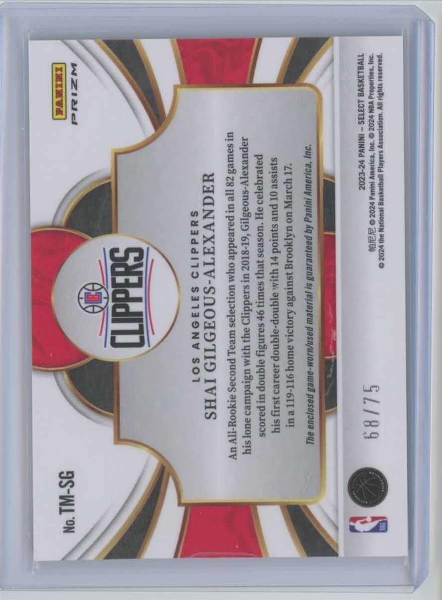 2023 Panini Select Throwback Jersey Shai Gilgeous-Alexander TM-SG 68/75 featuring Shai Gilgeous-Alexander from the Los Angeles Clippers. Card #TM-SG.