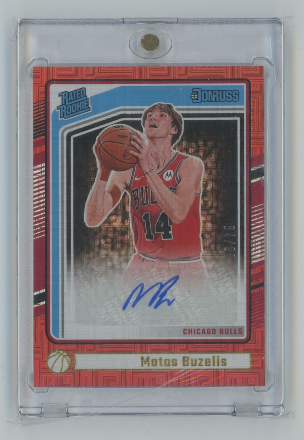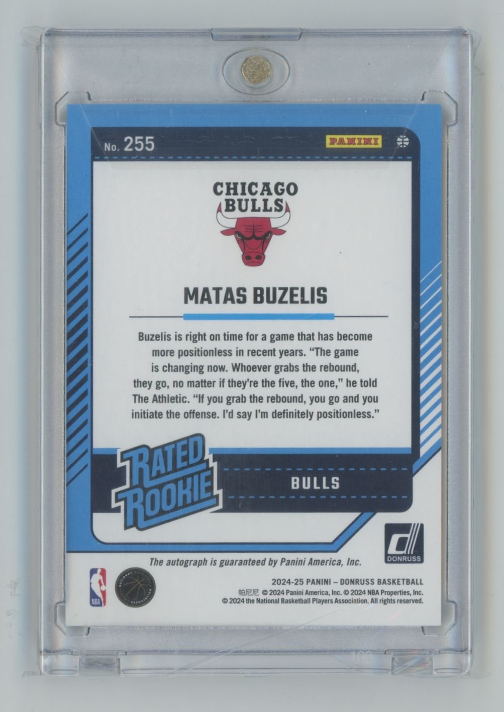 2024 Donruss Rated Rookies Signatures Matas Buzelis 255 rookie autographed 84/99 card from the Chicago Bulls.