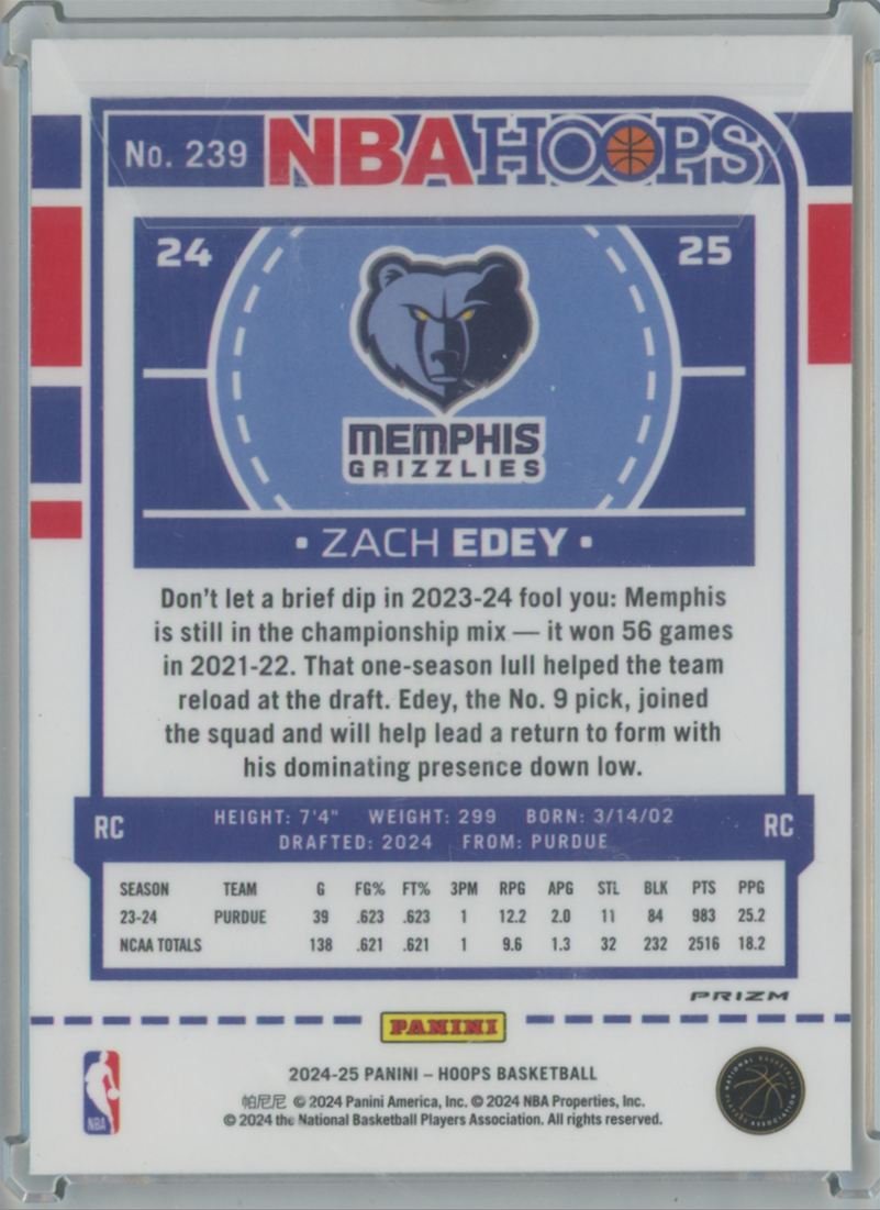2024 Hoops Zach Edey 239 rookie card from the Memphis Grizzlies.