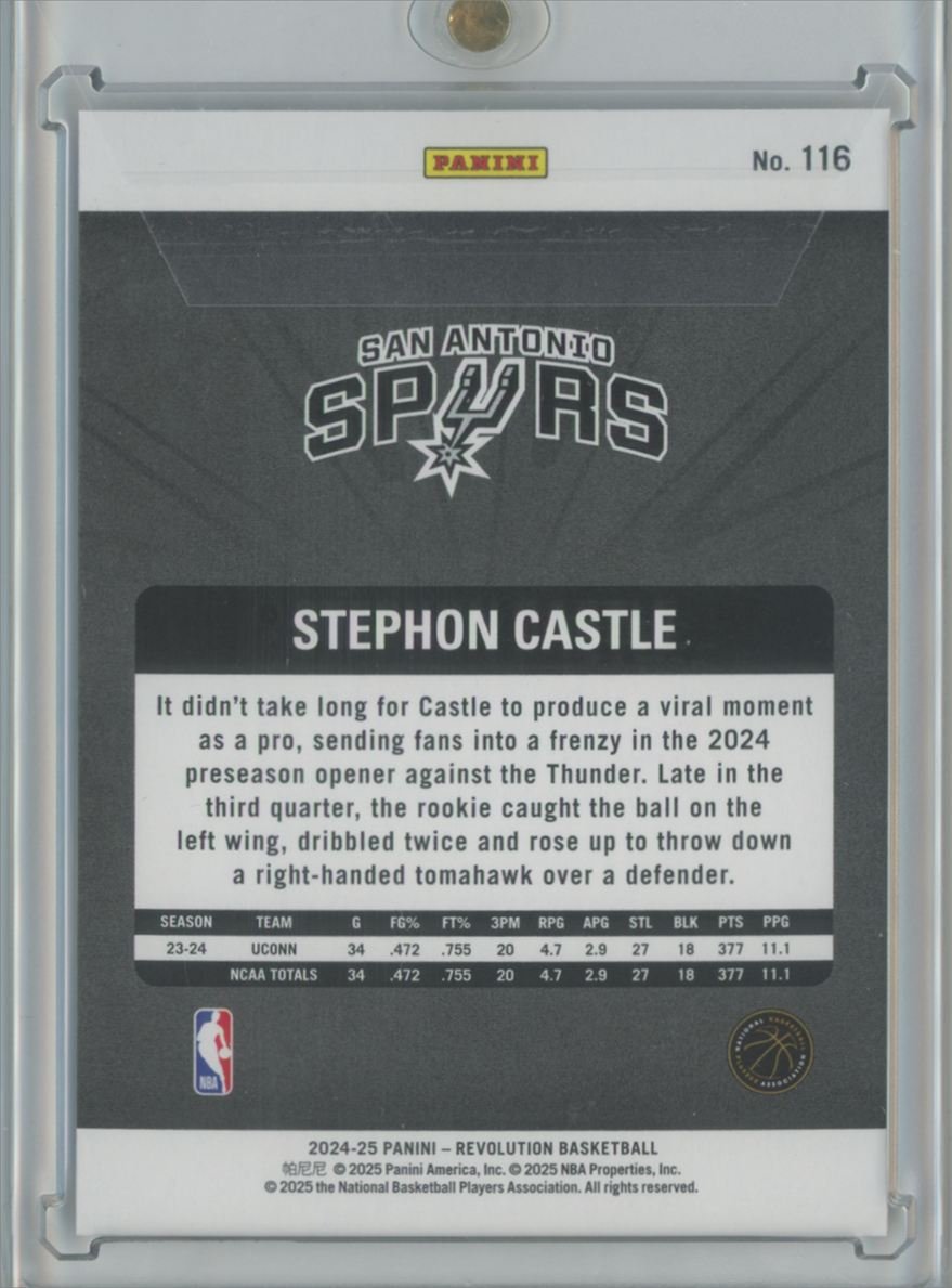 2024 Panini Revolution Stephon Castle 116 rookie card from the San Antonio Spurs.