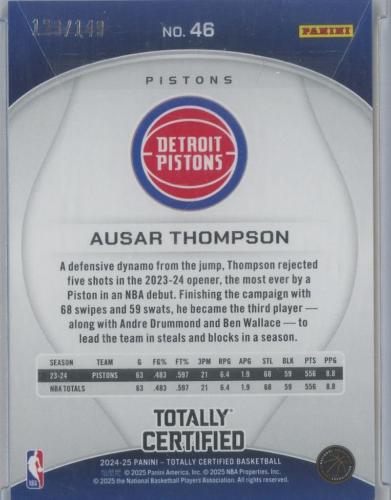 2024 Panini Totally Certified Ausar Thompson 46 123/149 card from the Detroit Pistons.