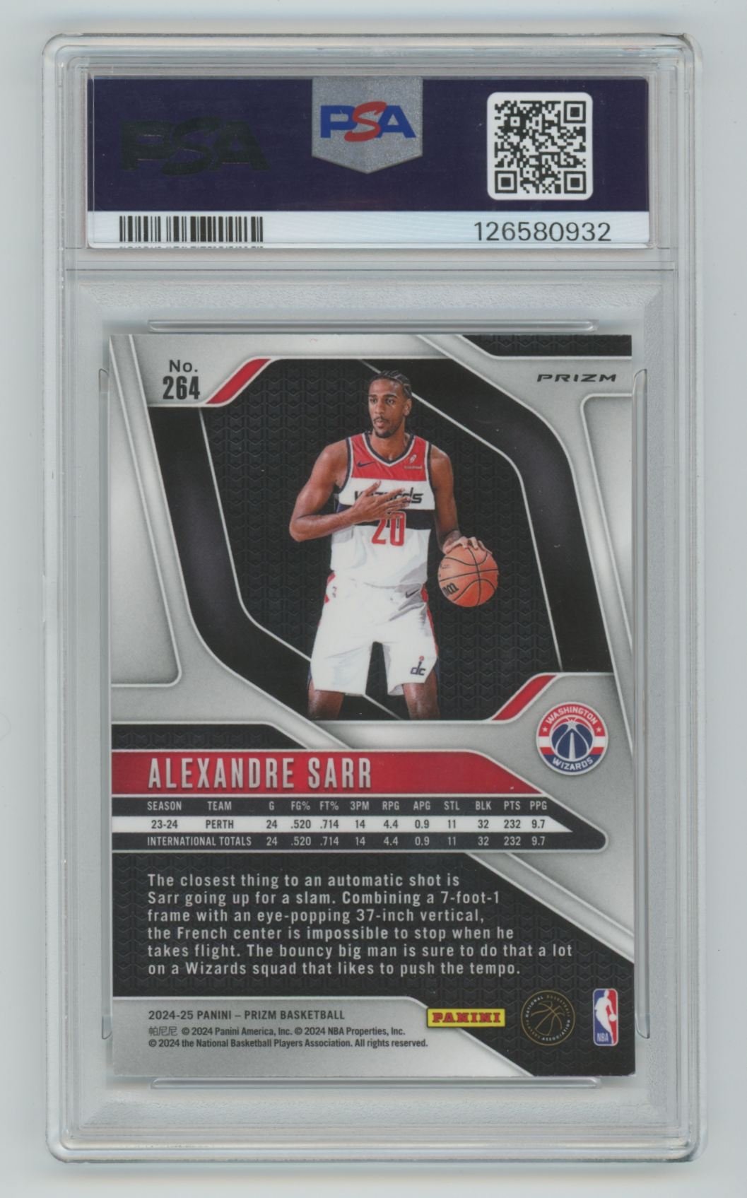 This is a 2024 Alexandre Sarr basketball card #264 from the Washington Wizards in the 2024 Panini Prizm Silver set and is a PSA Grade 9.