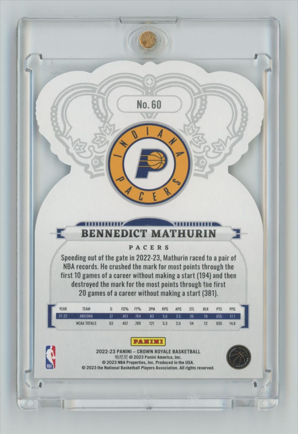 This is a 2022 Bennedict Mathurin basketball card #60 from the Indiana Pacers in the 2022 Panini Crown Royale RC set.