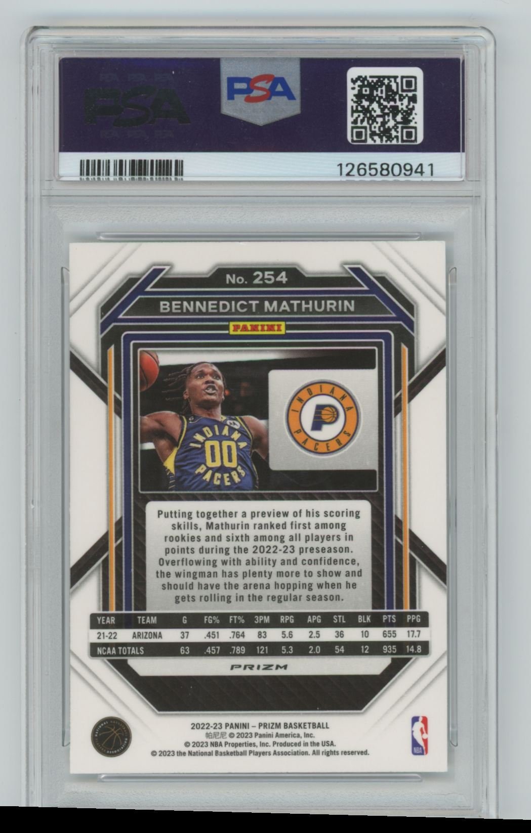 This is a 2022 Bennedict Mathurin basketball card #254 from the Indiana Pacers in the 2022 Panini Prizm Silver set and is a PSA Grade 8.