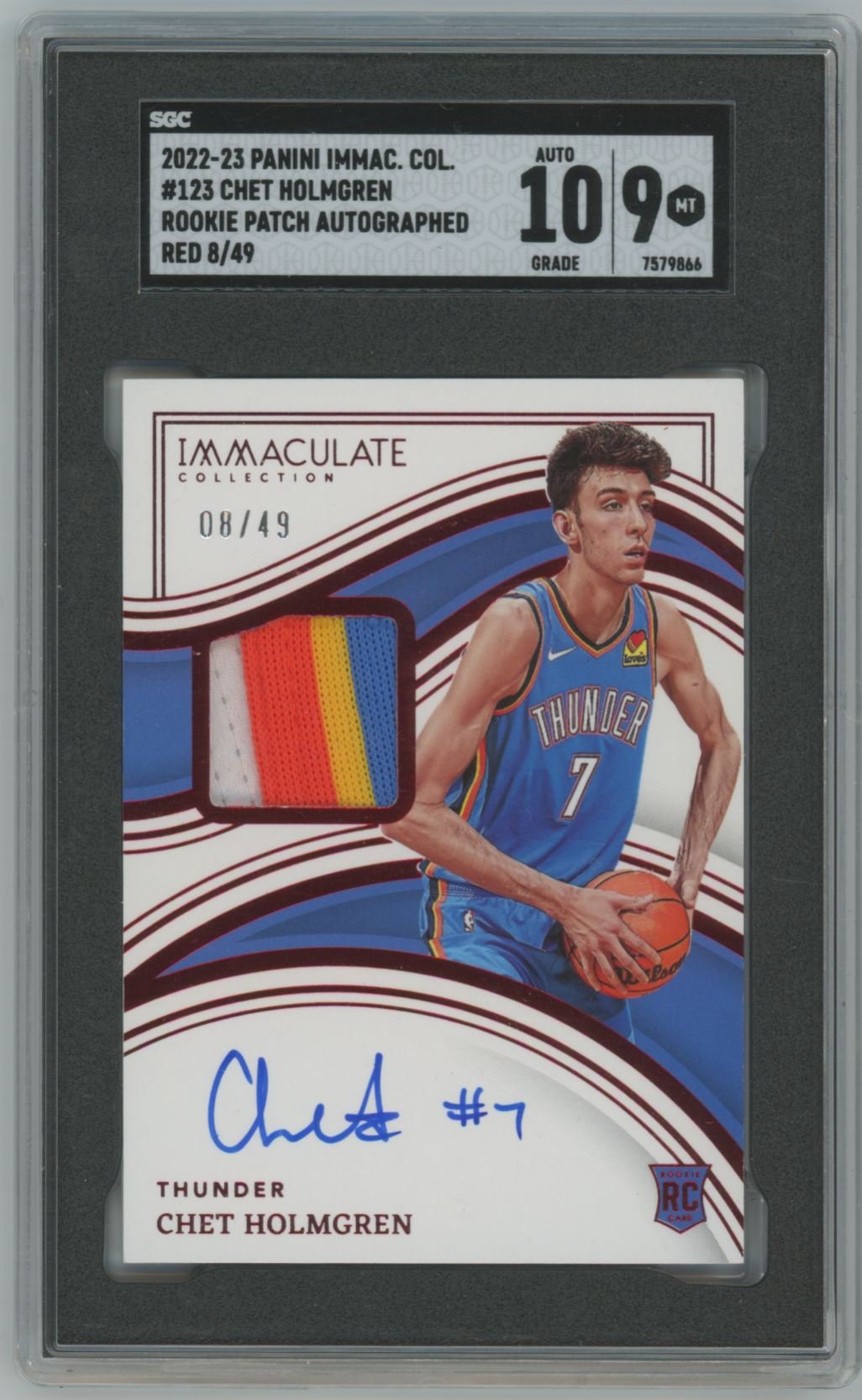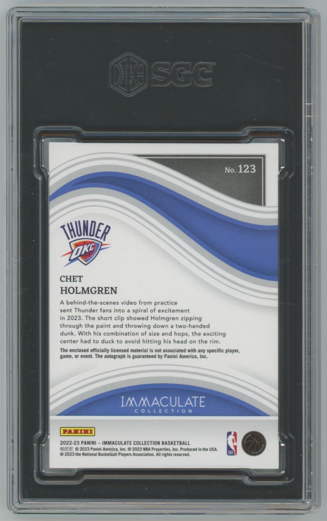 This is a 2022 Chet Holmgren basketball card #123 from the Oklahoma City Thunder in the 2022 Panini Immac set and is a SGC Grade 9.