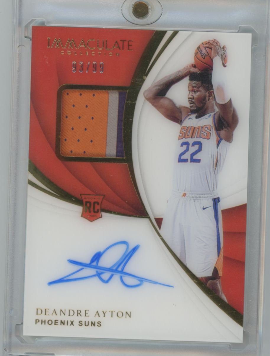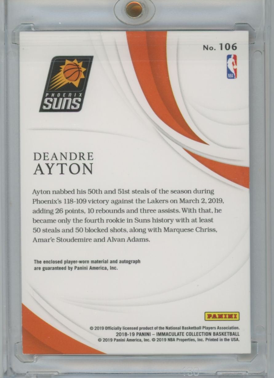This is a 2019 Deandre Ayton basketball card #106 from the Phoenix Suns in the 2019 Panini Immaculate Collection set.
