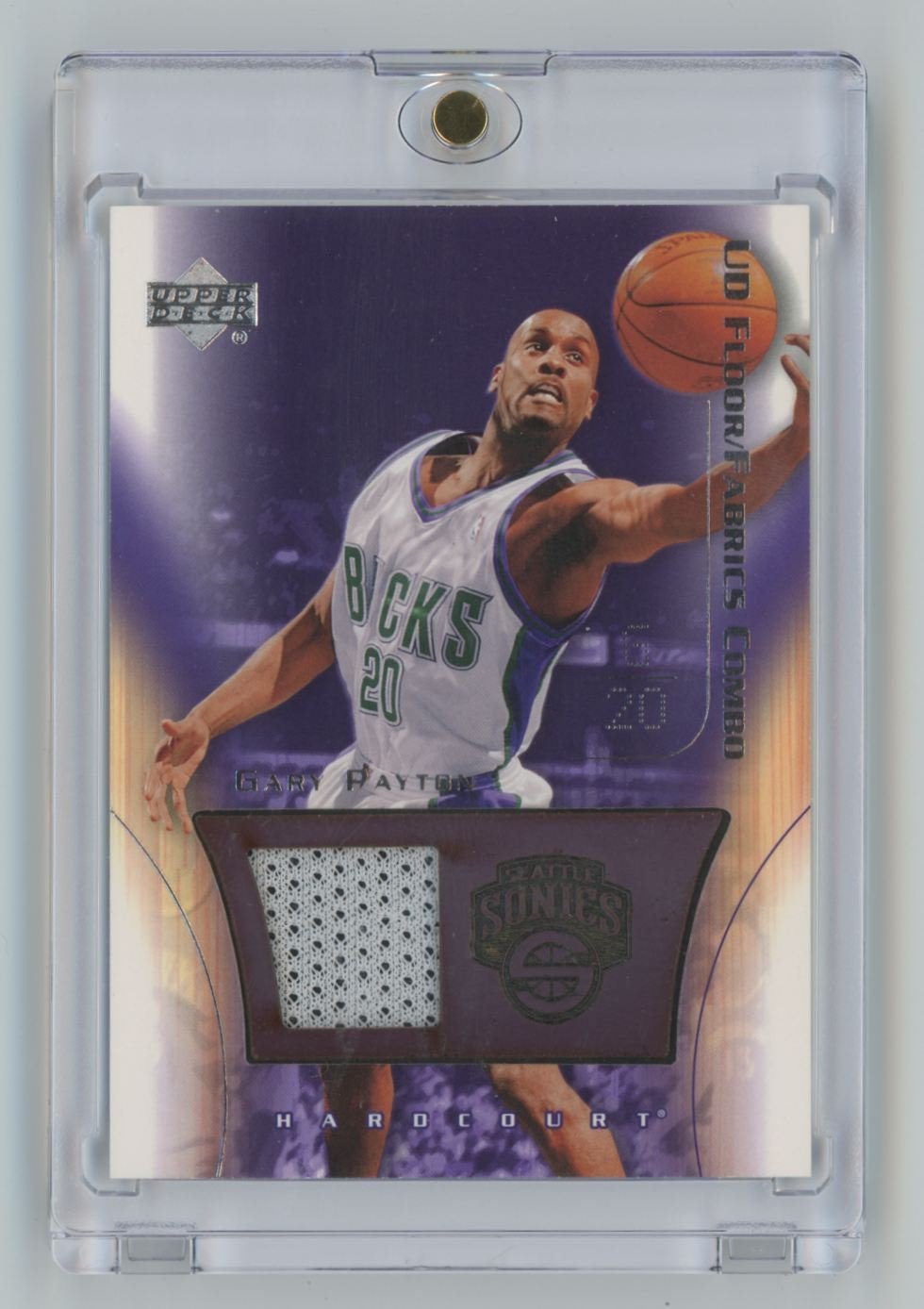 This is a 2003 Gary Payton basketball card #GP-FF from the Milwaukee Bucks in the 2003 Upper Deck Hardcourt Floor / Fabric Combos 2003 set.