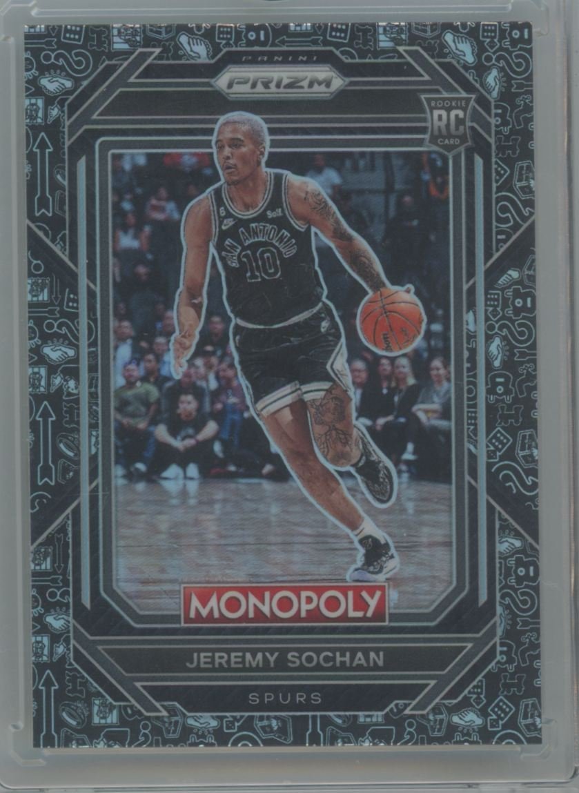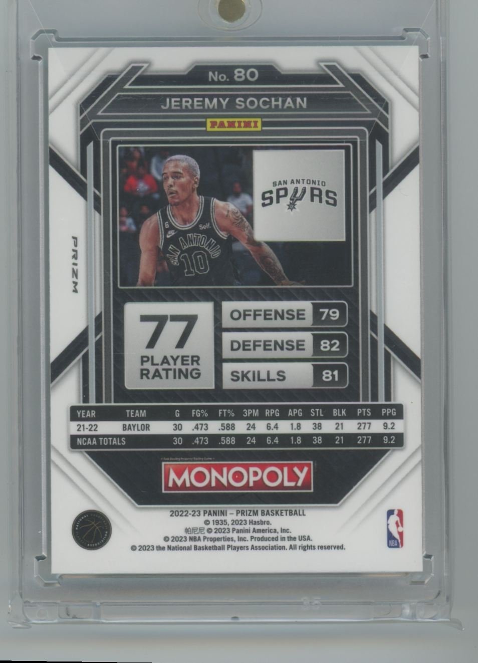This is a 2022 Jeremy Sochan basketball card #80 from the San Antonio Spurs in the 2022 Panini Prizm Monopoly set.