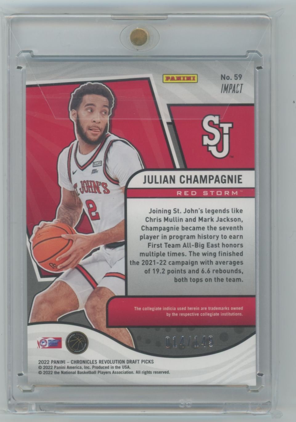 This is a 2022 Julian Champagnie basketball card #59 from the St. John’s Red Storm in the 2022 Panini Chronicles Revolution set.