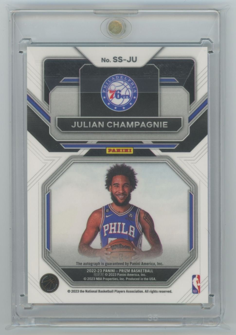 This is a 2022 Julian Champagnie basketball card #SS-JU from the San Antonio Spurs in the 2022 Panini Prizm set.